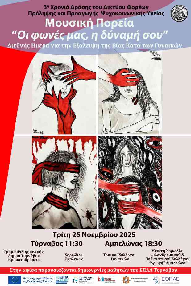 Μαθητές του ΕΠΑΛ Τυρνάβου, σε συνεργασία για δεύτερη συνεχή χρονιά με το Κέντρο Κοινότητας του Δήμου Τυρνάβου, στο πλαίσιο της δράσης – κοινωνικής ένταξης των μαθητών στο Δίκτυο Πρόληψης και Προαγωγής Ψυχοκοινωνικής Υγείας, συμμετείχαν στην Μουσική Πορεία με τίτλο: «Οι φωνές μας, η δύναμή σου», για τη Διεθνή Ημέρα για την εξάλειψη της βίας κατά των γυναικών.