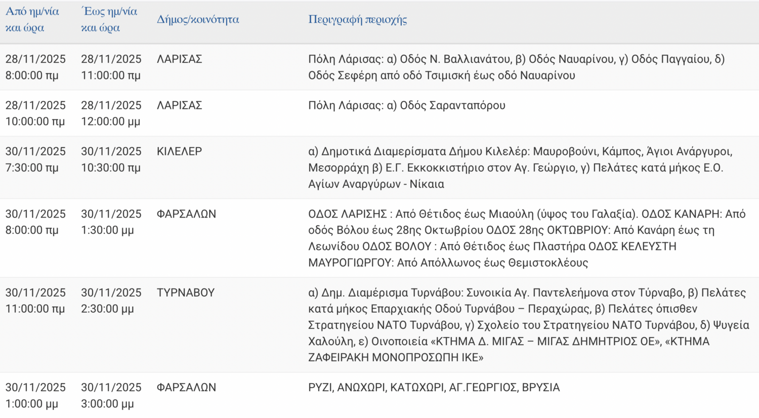 Σε προγραμματισμένες διακοπές στην παροχή ηλεκτρικού ρεύματος σε δρόμους της Λάρισας σήμερα Παρασκευή 28 Νοεμβρίου και σε περιοχές της Περιφερειακής Ενότητας την Κυριακή 30 Νοεμβρίου 2025 θα προχωρήσει ο ΔΕΔΔΗΕ Α.Ε.