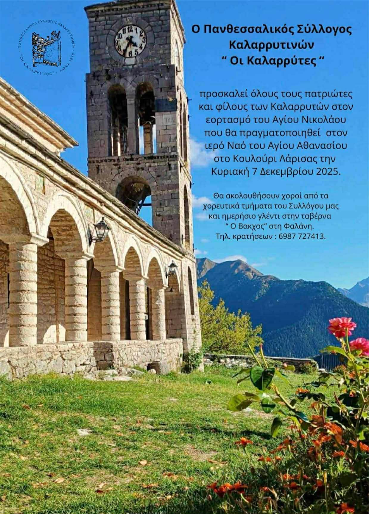Ο Πανθεσσαλικός Σύλλογος Καλαρρυτινών «ΟΙ ΚΑΛΑΡΡΥΤΕΣ» «σας προσκαλεί με τιμή στον εορτασμό του Αγίου Νικολάου που θα πραγματοποιηθεί στον Ιερό Ναό του Αγίου Αθανασίου στο Κουλούρι Λάρισας, την Κυριακή 7 Δεκεμβρίου 2025».