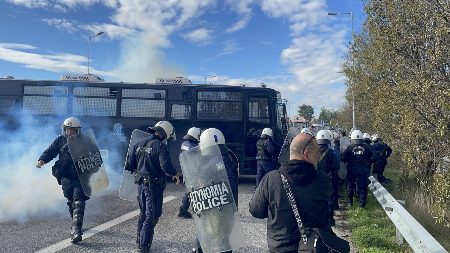 Ένταση με χρήση χημικών στο μπλόκο της Νίκαιας. Αγρότες προσπάθησαν να σπάσουν το φραγμό της αστυνομίας, σπρώχνοντας κλούβα της αστυνομίας με αποτέλεσμα να γίνει χρήση χημικών.
