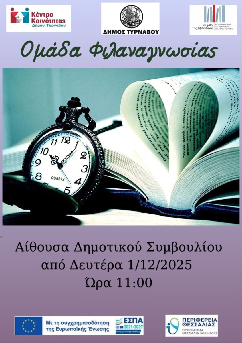 Το Κέντρο Κοινότητας του Δήμου Τυρνάβου σε συνεργασία με τoν σύλλογο «Οι φίλοι της βιβλιοθήκης» του Δήμου Τυρνάβου, στο πλαίσιο δράσης του Δικτύου Φορέων Πρόληψης και Προαγωγής Ψυχοκοινωνικής Υγείας, διοργανώνουν ομάδα φιλαναγνωσίας στον Αμπελώνα.