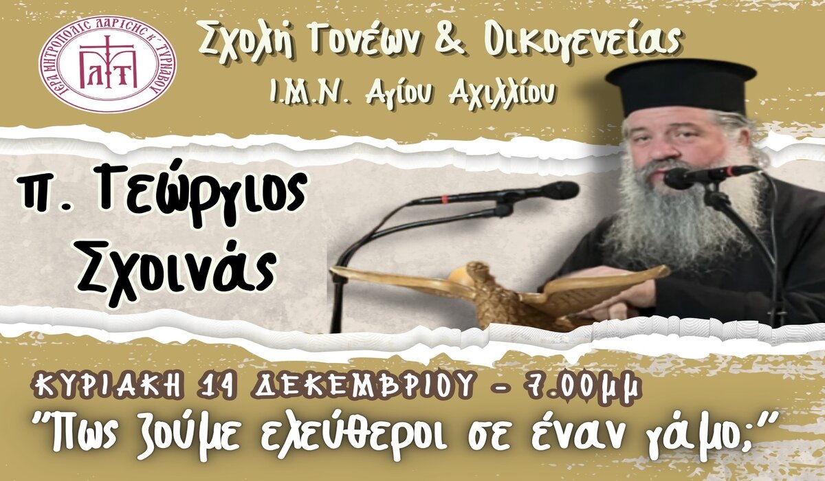 Η επόμενη ομιλία θα γίνει την Κυριακή 14 Δεκεμβρίου 2025, στις 7.00 μ.μ. στον Ι.Μ.Ν.Αγίου Αχιλλίου. Προσκεκλημένος ομιλητής είναι ο π.Γεώργιος Σχοινάς, ο οποίος θα αναπτύξει το θέμα: «Πώς ζούμε ελεύθεροι μέσα στον γάμο;».