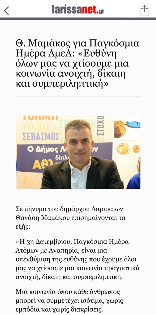 Συμπολίτης απευθύνθηκε στο larissanet.gr μετά και το μήνυμα του Δημάρχου Λαρισαίων Θανάση Μαμάκου για την Παγκόσμια Ημέρα Ατόμων με Αναπηρία (3 Δεκεμβρίου), αντιπαραβάλλοντάς το με συγκεκριμένα σημεία μετά από έργα στη Λάρισα, όπου προφανώς η πρόσβαση των ΑμεΑ γίνεται μετ’ εμποδίων…