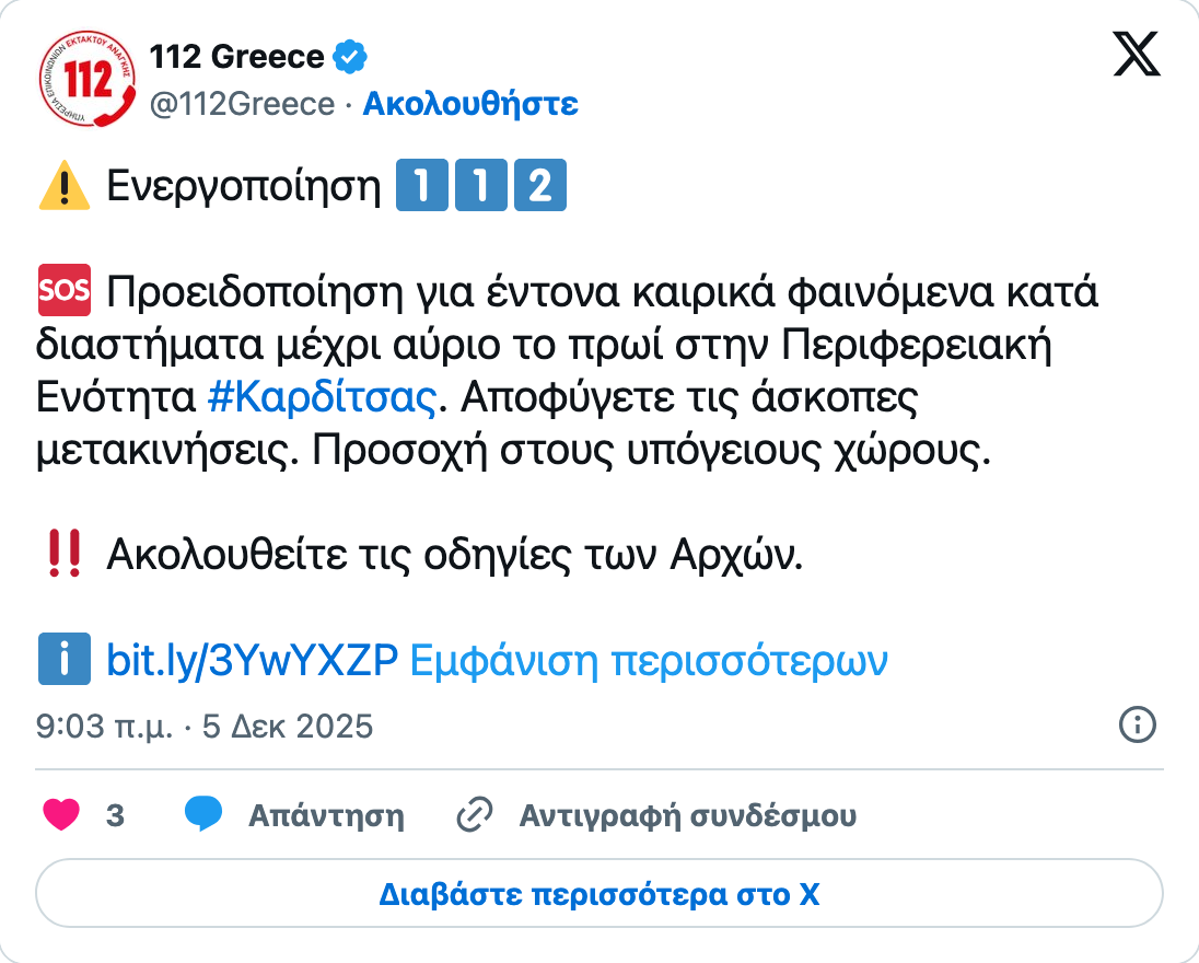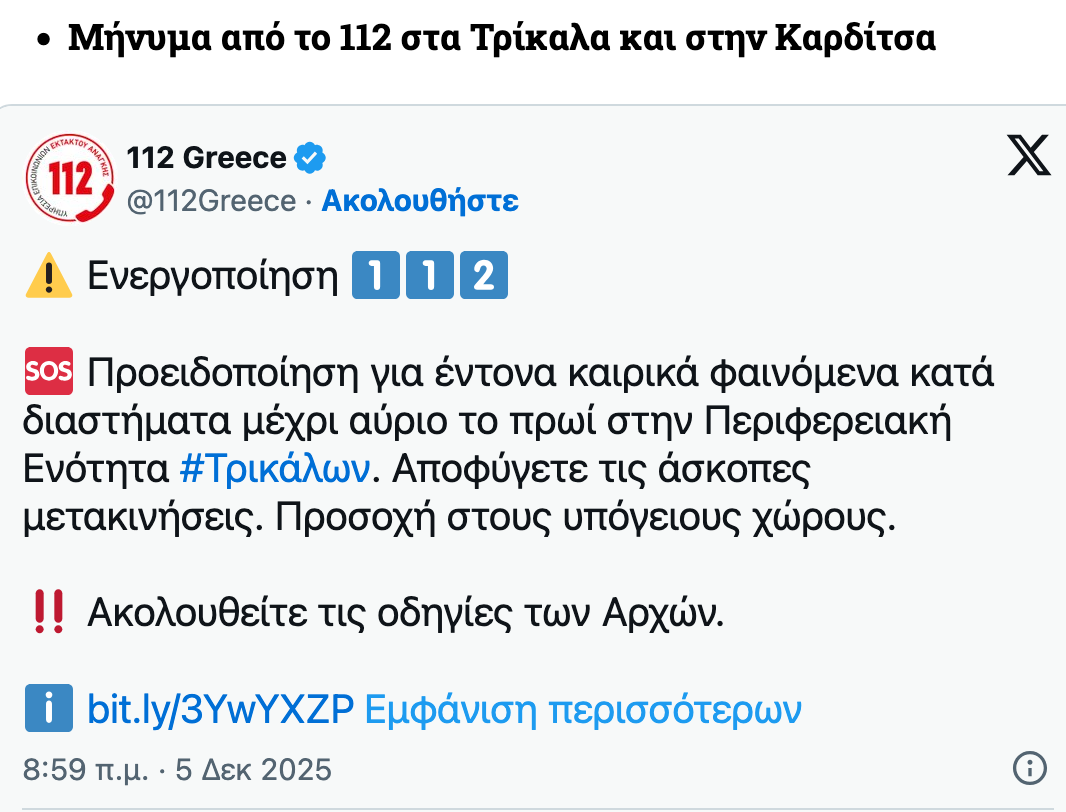 Το 112 ήχησε σε Τρίκαλα, Καρδίτσα και Φθιώτιδα.
