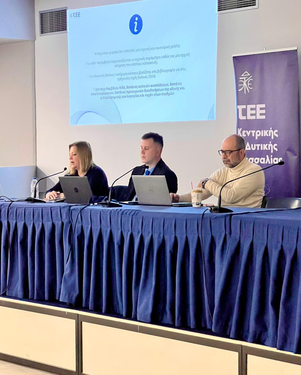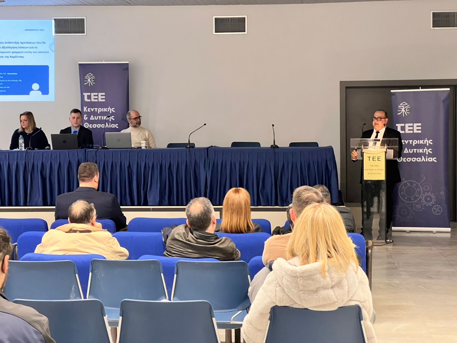 Άλλη μια σημαντική πρωτοβουλία πραγματοποιήθηκε στην Αίθουσα εκδηλώσεων «Ιωάννης Βαρνάς» του Περιφερειακού Τμήματος Κεντρικής και Δυτικής Θεσσαλίας του ΤΕΕ, η οποία αφορούσε στην παρουσίαση του έργου της Ομάδας Εργασίας του Τμήματος με τίτλο: «Βελτιστοποίηση της ασφάλειας μέσω ανάπτυξης προτάσεων που θα προκύψουν από τη διερεύνηση και αξιολόγηση λύσεων για το πρόβλημα της διέλευσης σιδηροδρομικών γραμμών εντός του αστικού ιστού της Λάρισας, των Τρικάλων και της Καρδίτσας».