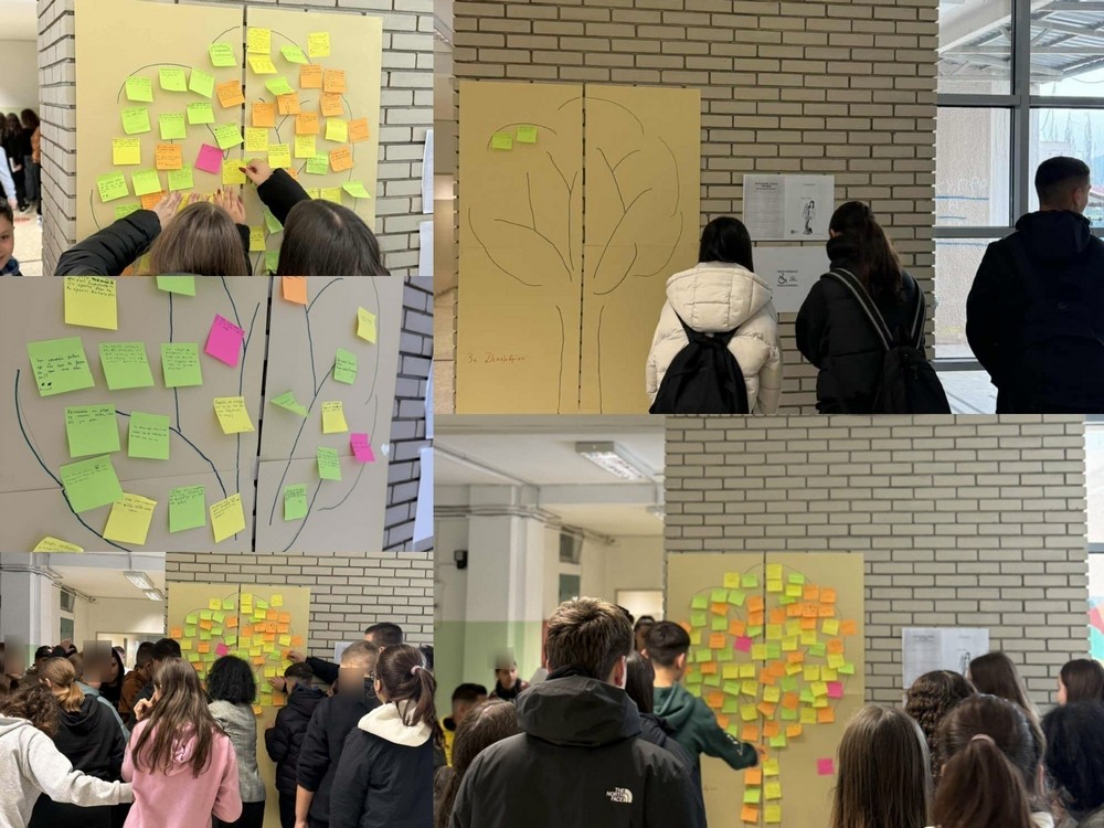 Α. Αρχικά, οι μαθητές/τριες ενημερώθηκαν για την παγκόσμια ημέρα στα τμήματά τους και τη σημασία της αναδεικνύοντας την ανάγκη σεβασμού της διαφορετικότητας. Κατόπιν, αντάλλαξαν απόψεις, είδαν ταινίες μικρού μήκους, αξιοποίησαν τις ΤΠΕ. Η κύρια δράση όλης της σχολικής κοινότητας ήταν να διατυπώσουν ο καθένας μαθητής και η καθεμιά μαθήτρια ένα μήνυμα προς έναν/μία συμμαθητή ή συμμαθήτρια, φίλο ή φίλη με αναπηρία. Ολοκλήρωσαν τη δράση τοποθετώντας τα μηνύματά τους στο «Δέντρο της Αποδοχής», μια εικαστική δημιουργία στον χώρο του Σχολείου, Ενα δέντρο στολισμένο με τα μηνύματά τους που δείχνει ότι το σχολείο μας είναι ένας χώρος ανοιχτός, φιλικός και συμπεριληπτικός.