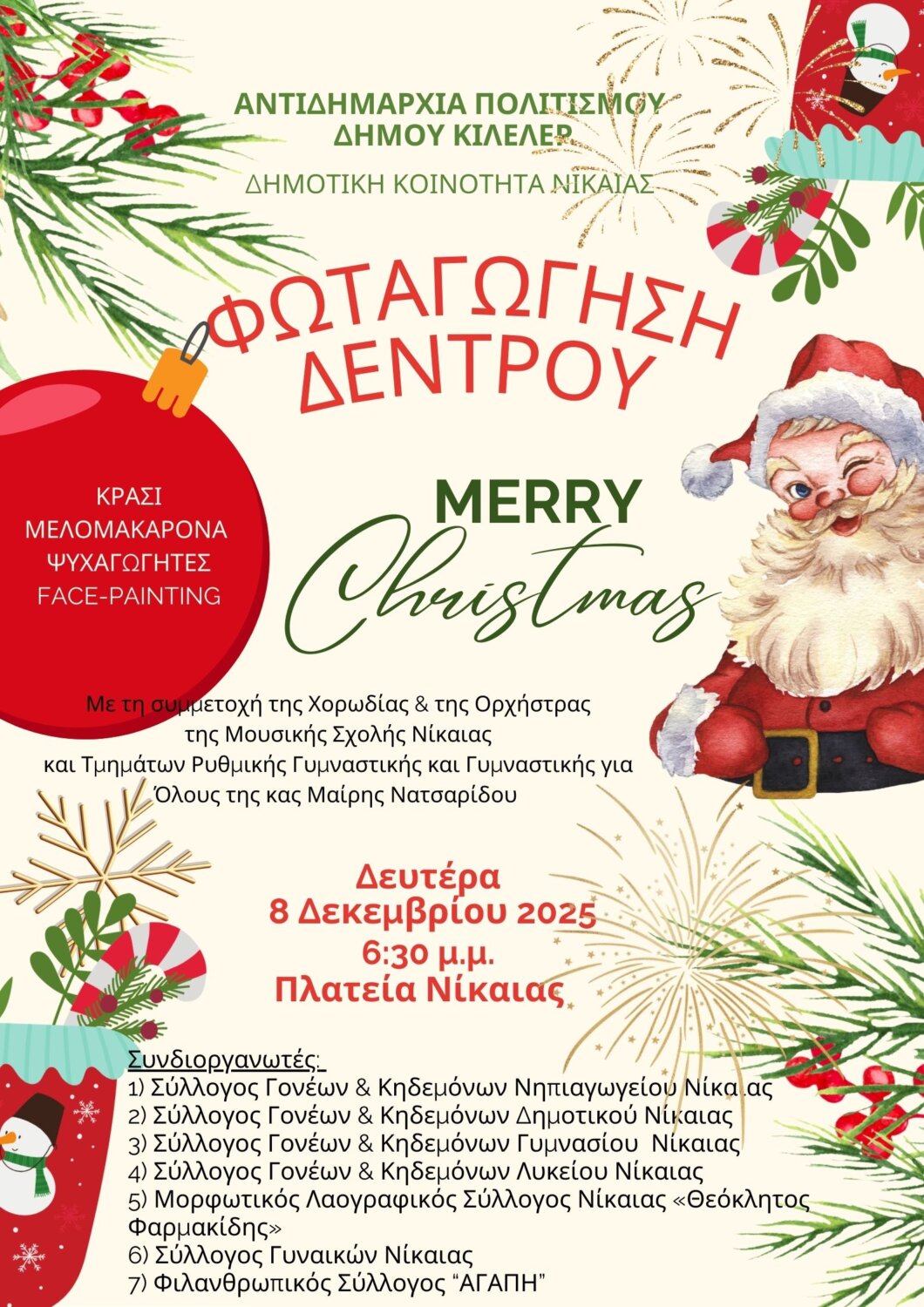 Η πιο λαμπρή ημέρα του χρόνου πλησιάζει για τη Νίκαια την πρωτεύουσα του Δήμου Κιλελέρ. Τη Δευτέρα 8 Δεκεμβρίου στις 18:30 θα φωταγωγηθεί, με κάθε μεγαλοπρέπεια το Χριστουγεννιάτικο δέντρο στην κεντρική πλατεία.