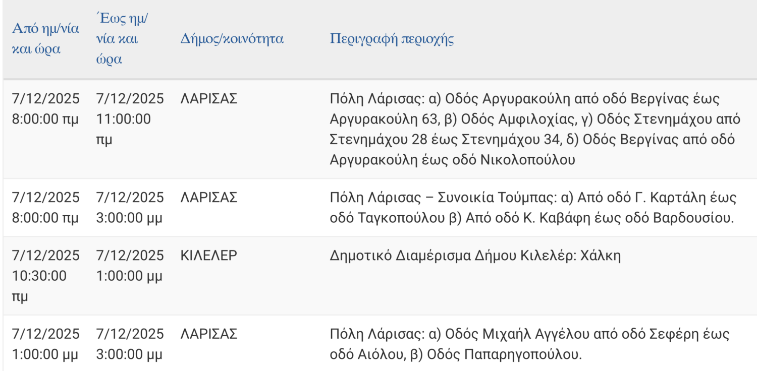 Σε προγραμματισμένες διακοπές στην παροχή ηλεκτρικού ρεύματος σε δρόμους της Λάρισας και στη Χάλκης του Δήμου Κιλελέρ θα προχωρήσει την Κυριακή 7 Δεκεμβρίου 2025 ο ΔΕΔΔΗΕ Α.Ε.