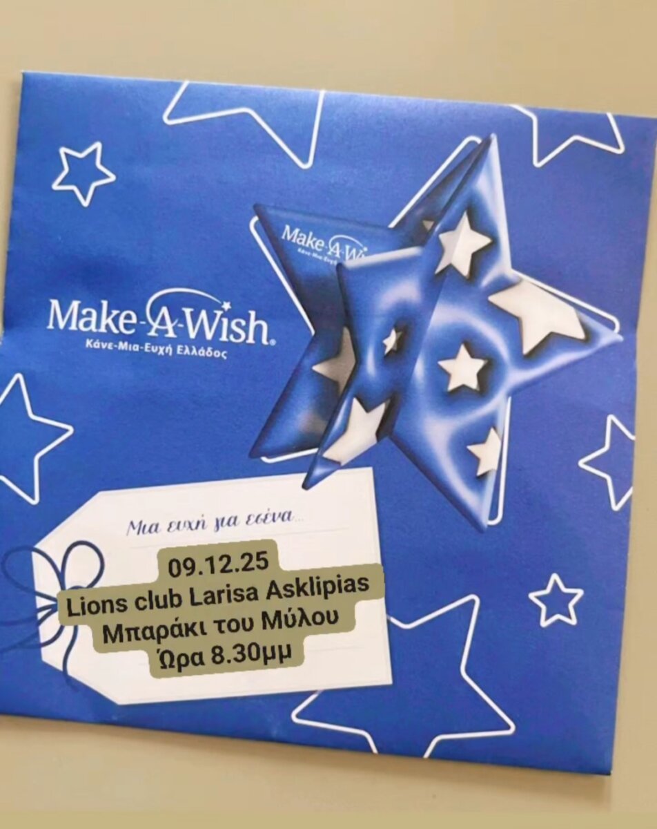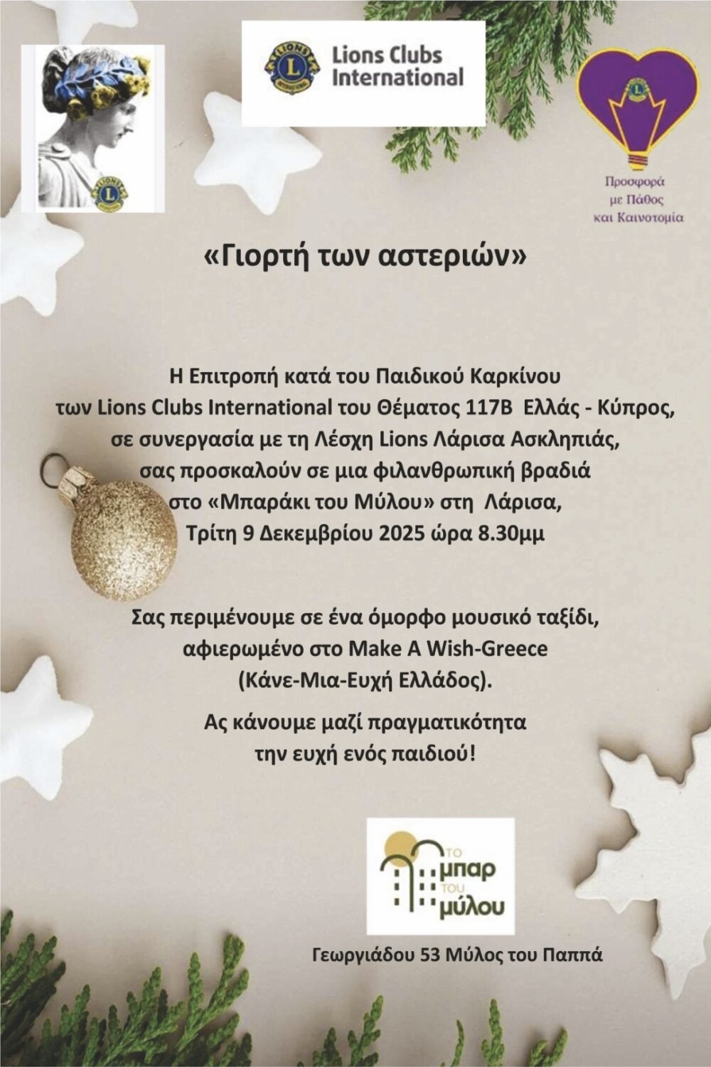 Η λέσχη Lions Λάρισα Aσκληπιάς σε συνεργασία με την Επιτροπή κατά του Παιδικού Καρκίνου των Lions του Θέματος 117Β Ελλάδα Κύπρος που ανήκουν στο μεγαλύτερο ανθρωπιστικό οργανισμό παγκοσμίως με 1,5 εκατομμύριο μέλη σε ολόκληρο τον κόσμο, μας προσκαλούν την Τριτη 9 Δεκεμβρίου στις 8:30μμ στο Μπαράκι του Μυλου να υποστηρίξουμε την φιλανθρωπική βραδιά «Γιορτή των Αστεριών».