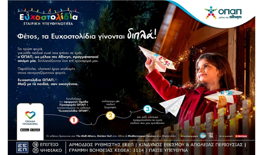 Για πρώτη φορά, ο ΟΠΑΠ – μέλος της Allwyn – ενισχύει ακόμη περισσότερο τη δράση προσφοράς. Για κάθε ευχή που πραγματοποιείται, ο ΟΠΑΠ υλοποιεί μία ακόμη, διπλασιάζοντας με αυτό τον τρόπο τον αντίκτυπο και την αξία της πρωτοβουλίας.