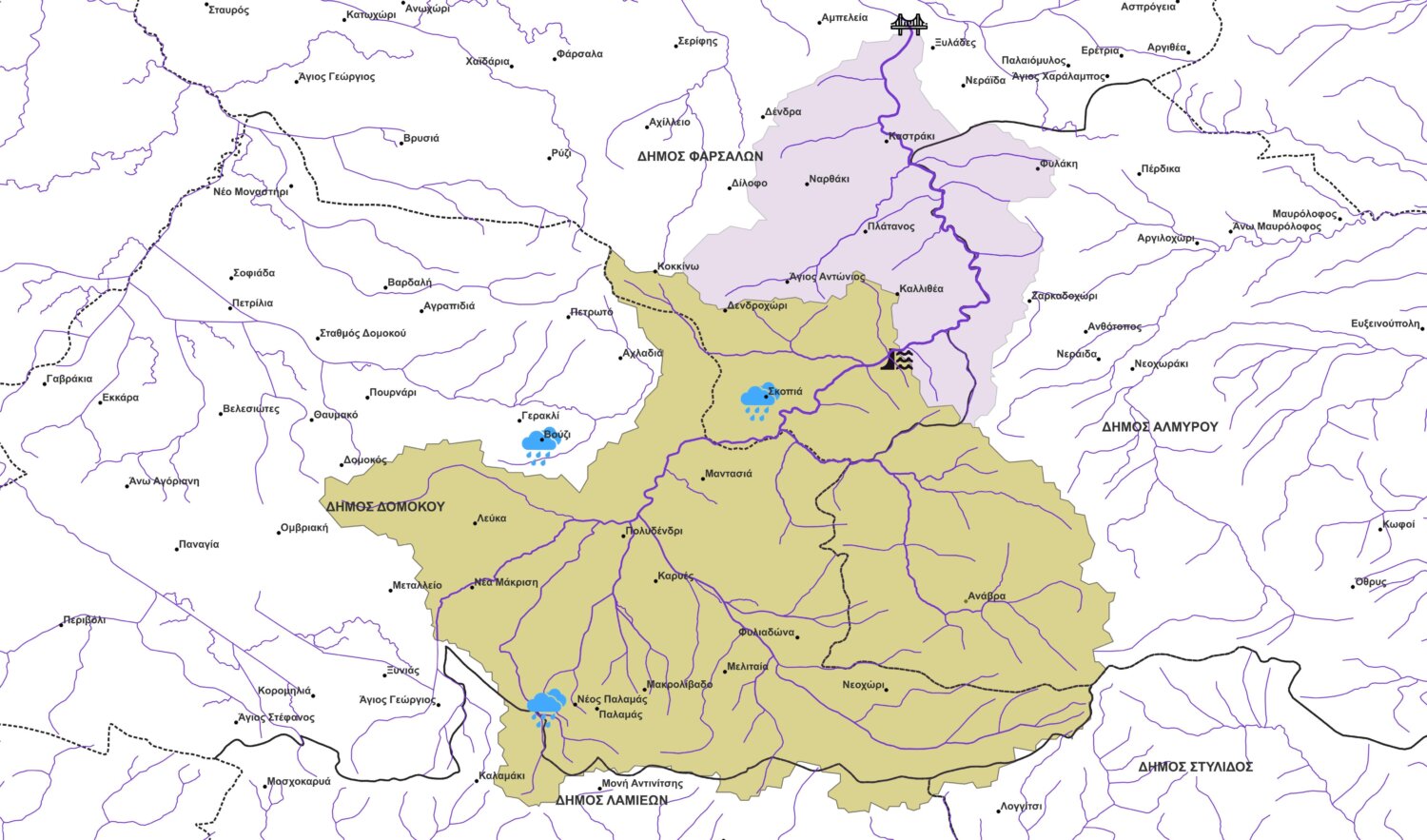 Εικόνα 1. Η απεικόνιση, της «λεκάνης απορροής» (επιφάνεια με «ανοιχτή πράσινη απόχρωση») (του «”Ενιπέα Ποταμού” που αντιστοιχεί έως την θέση όπου σχεδιάστηκε αρχικά να κατασκευαστεί το «“Φράγμα Σκοπιάς” (στην θέση “Παλιοδερλί”)», η οποία βρίσκεται περίπου στην θέση ανάμεσα στον οικισμό «Σκοπιά» και στον οικισμό «Καλλιθέα») και της «λεκάνης απορροής» (το άθροισμα της επιφάνειας με «ανοιχτή πράσινη απόχρωση» και της επιφάνειας με «ανοιχτή γκρι απόχρωση») (του «”Ενιπέα Ποταμού” που αντιστοιχεί έως την θέση στην «“Ιρλανδική Διάβαση” (“ράμπα”) της “Γέφυρας Αμπελιάς”», η οποία βρίσκεται περίπου στην θέση ανάμεσα στον οικισμό «Αμπελιά» και στον οικισμό «Ξυλάδες»), του «υδρογραφικού (γραμμικού) δικτύου» (γραμμές με «έντονη μπλε» απόχρωση με διαβάθμιση του πάχους της γραμμής, όπου το πάχος της κάθε γραμμής εξαρτάται από την “τάξη” του εκάστοτε ρέματος που αντιπροσωπεύει δηλαδή όσο μεγαλύτερη είναι η “τάξη” του ρέματος τόσο παχύτερη είναι και η αντίστοιχη γραμμή που το αντιπροσωπεύει), των «οικισμών του Δήμου Φαρσάλων», των «οικισμών του Δήμου Δομοκού» και των «οικισμών του Δήμου Αλμυρού» (κουκίδες με «μαύρη απόχρωση» και ονομασία, επίσης, με «μαύρη απόχρωση»), του «περιγράμματος του “Δήμου Φαρσάλων”», του «περιγράμματος του “Δήμου Δομοκού”» και του «περιγράμματος του “Δήμου Αλμυρού”» (γραμμές με «μαύρη απόχρωση»), όπως απεικονίζονται στο «ελεύθερο διαδικτυακά λογισμικό» «Q.G.I.S.» [4], μέσω των σχετικών αρχείων που ανακτήθηκαν τόσο από την σχετική διαδικτυακή «πλατφόρμα» («Copernicus») όσο και από την σχετική διαδικτυακή «πλατφόρμα» («ΕΛ.ΣΤΑΤ.»),[1,2,4,12].