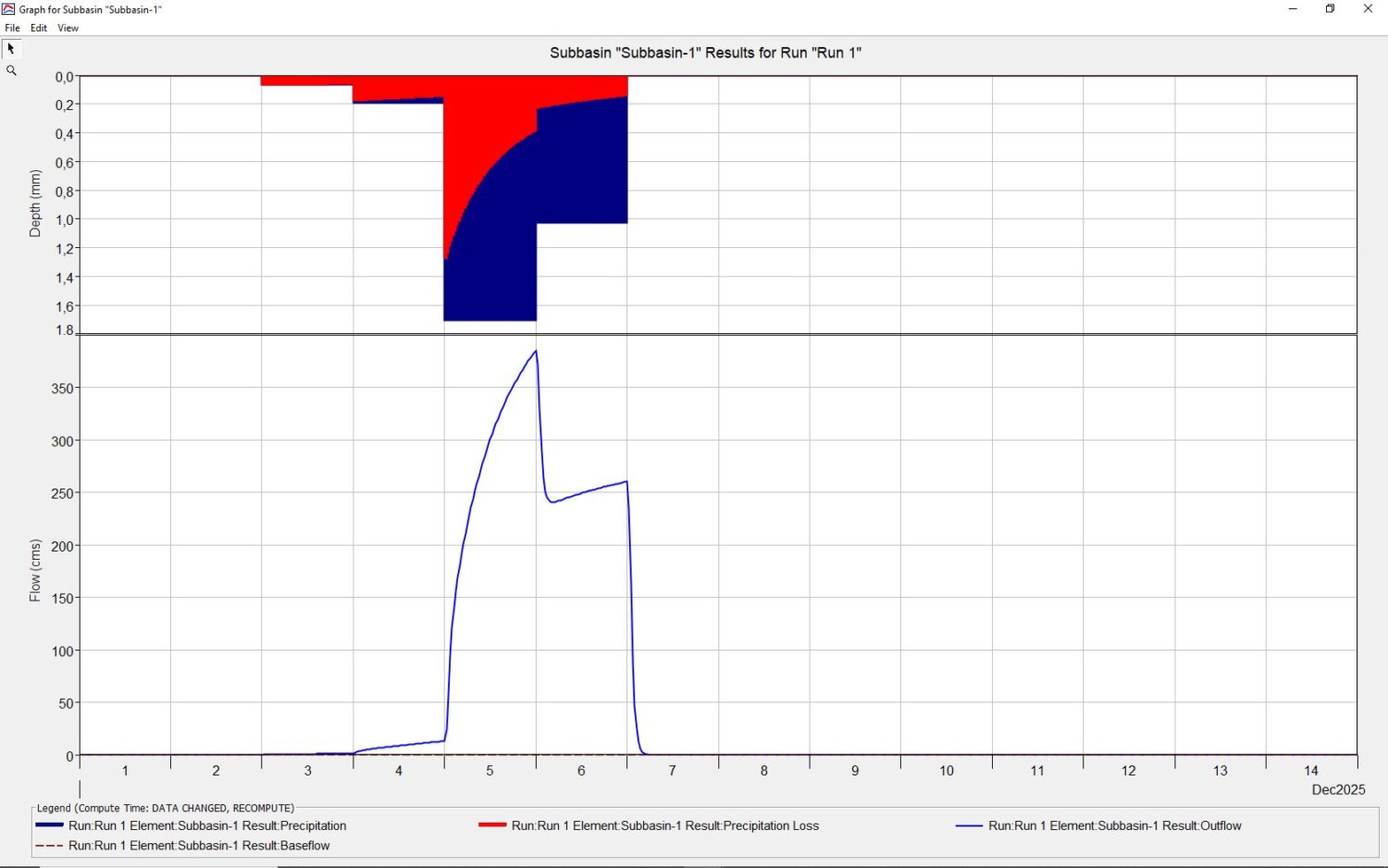 Επιπλέον, αρχικά, στην παρακάτω εικόνα απεικονίζεται το, “προσομοιωμένο ρεαλιστικό”, «διάγραμμα / ιστόγραμμα βροχόπτωσης / απορροής» του χρονικού διαστήματος, “03-06/12/2025” (“143,40 mm”), (το οποίο και «απέδωσε» την, “προσομοιωμένη ρεαλιστική”, παροχή αιχμής νερού και συγκεκριμένα «384,70 κυβικά μέτρα ανά δευτερόλεπτο» ή αλλιώς «384,70 m3/sec»), [το οποίο και «απέδωσε», λόγω του ακραίου μετεωρολογικού φαινομένου με την κωδική ονομασία «Byron», την, “προσομοιωμένη ρεαλιστική”, συνολική ποσότητα νερού, συγκεκριμένα, «47.985.600 κυβικά μέτρα (τόννους νερού)» ή αλλιώς «47.985.600 m3 (τόννους νερού)»], και το αντίστοιχο, “προσομοιωμένο ρεαλιστικό”, «υδρογράφημα απορροής πλημμύρας» που προκύπτει από το συγκεκριμένο, “προσομοιωμένο ρεαλιστικό”, επεισόδιο βροχόπτωσης, (λόγω του ακραίου μετεωρολογικού φαινομένου με την κωδική ονομασία «Byron»), (η ανάλυση και οι υπολογισμοί έγιναν με το ελεύθερο στο διαδίκτυο λογισμικό «HEC–HMS» του «U.S.A. Army Corps of Engineers» δηλαδή του «Σώματος Μηχανικών του Στρατού των Η.Π.Α.») [1,2,4,5,6.1,6.5,7].
