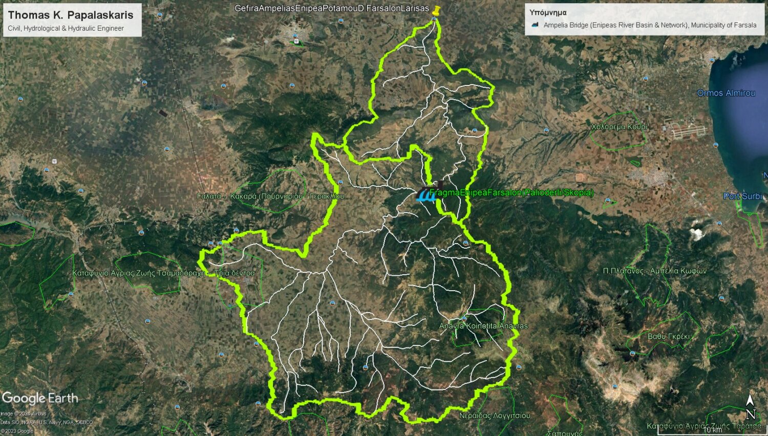Εικόνα 3. Η απεικόνιση της λεκάνης απορροής, [εξωτερική επιφάνεια/εξωτερικό περίγραμμα με «ανοιχτή πράσινη» απόχρωση, που αντιστοιχεί έως την θέση όπου έχει κατασκευαστεί η «“Ιρλανδική Διάβαση” (“ράμπα”) της “Γέφυρας Αμπελιάς”», (“Δήμου Φαρσάλων”), Π.Ε. (Νομού) Τρικάλων”» («εικονίδιο πινέζας με κίτρινη απόχρωση»)], [εσωτερική επιφάνεια/εσωτερικό περίγραμμα με «ανοιχτή πράσινη» απόχρωση, που αντιστοιχεί έως την θέση όπου σχεδιάστηκε αρχικά να κατασκευαστεί το «“Φράγμα Σκοπιάς” στην θέση “Παλιοδερλί”», (“Δήμου Φαρσάλων”), Π.Ε. (Νομού) Τρικάλων”» («σχετικό συμβολικό εικονίδιο αναπαράστασης φράγματος με μπλε και μαύρη απόχρωση»)] και του (πλήρως ανεπτυγμένου) αντίστοιχου, περιεχόμενου σε αυτήν, υδρογραφικού δικτύου (γραμμές με «άσπρη» απόχρωση), του «Ενιπέα Ποταμού» επί του υπόβαθρου της διαδικτυακής πλατφόρμας «Google Earth» [1,2,4,10].