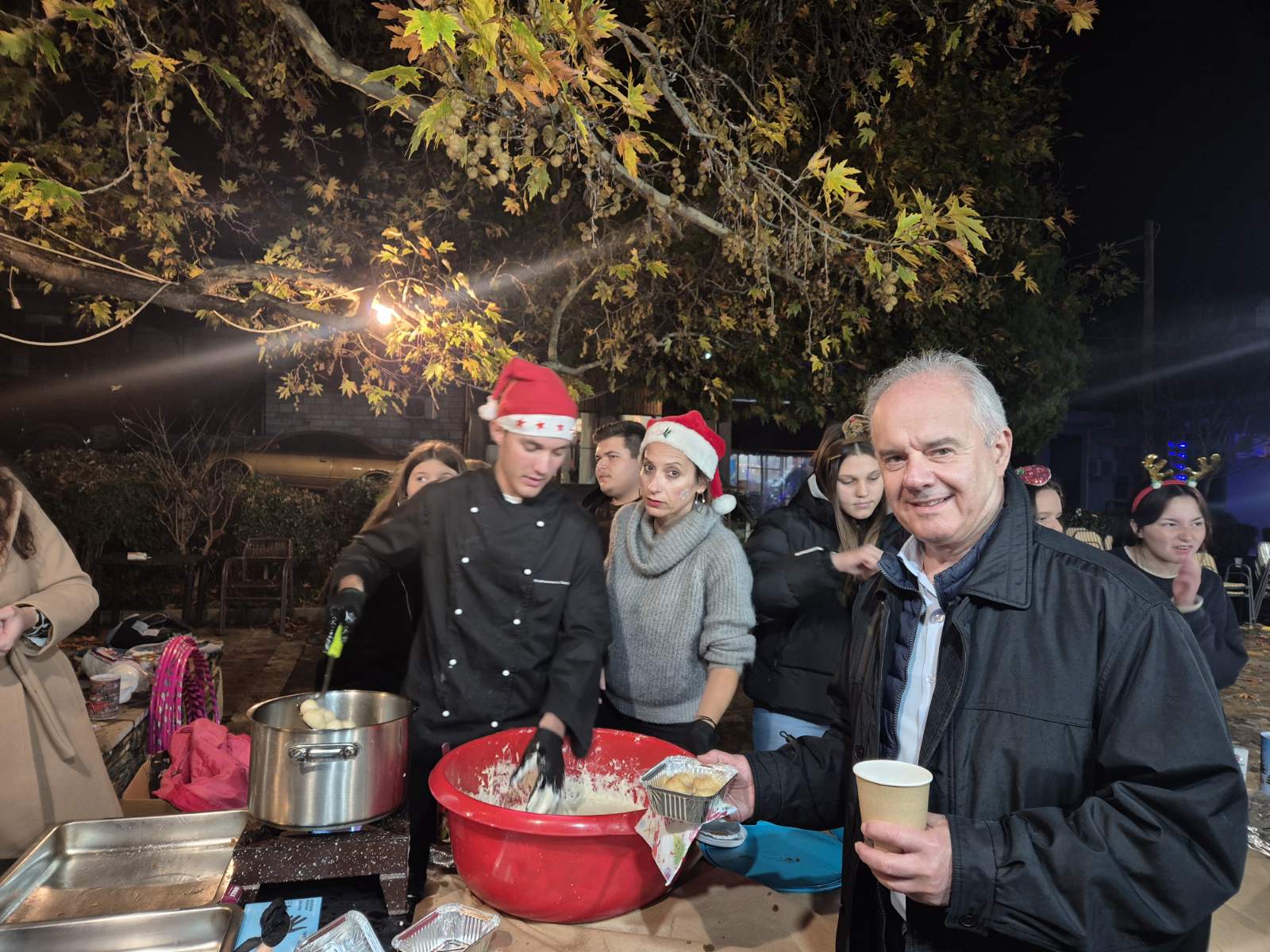 Το ίδιο απόγευμα, ο Δήμαρχος παρευρέθηκε στην έδρα του Δήμου, το Μακρυχώρι, όπου πλήθος κατοίκων και επισκεπτών συγκεντρώθηκε για το άναμμα του Χριστουγεννιάτικου δέντρου. Μαζί με τα παιδιά μέτρησαν αντίστροφα και το μεγάλο δέντρο φωταγωγήθηκε εντυπωσιακά, ενώ φαναράκια φώτισαν τον ουρανό. Τη στιγμή αυτή «έπεσε» και τεχνητό χιόνι, προκαλώντας ενθουσιασμό στα παιδιά, τα οποία διασκέδασαν με τον Άη Βασίλη και το ξωτικό που μοίρασαν δώρα και ζωγράφισαν τα πρόσωπά τους.