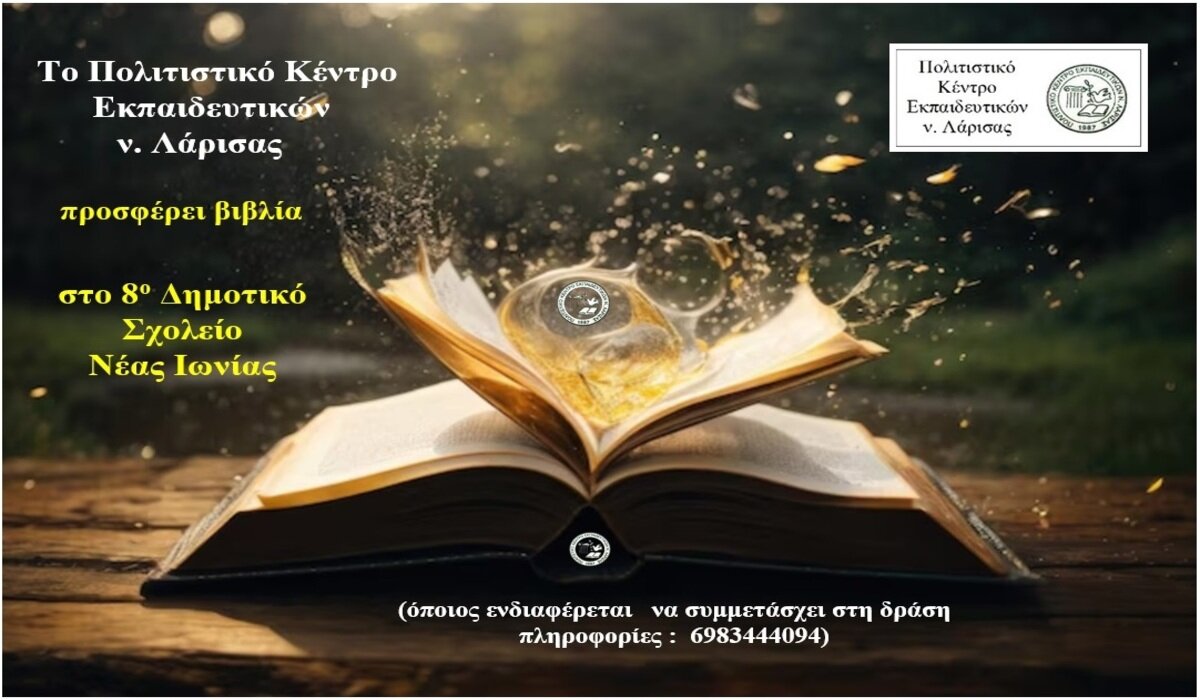 Το Πολιτιστικό Κέντρο Εκπαιδευτικών νομού Λάρισας – ΠΟΚΕΛ θα προσφέρει βιβλία στο 8ο Δημοτικό Σχολείο Νέας Ιωνίας, μετά από πρόσκληση της διευθύντριας Δώσσα Αικατερίνη και του Συλλόγου Εκπαιδευτικών του σχολείου, καθώς και πρωτοβουλία του Διονύση Λεϊνομή, ώστε να ενισχυθεί η σχολική βιβλιοθήκη με νέους τίτλους βιβλίων.