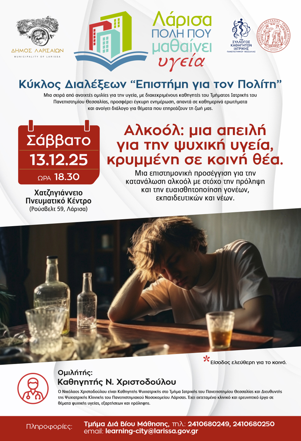 Σε μια εποχή όπου η κατανάλωση αλκοόλ θεωρείται κοινωνικά αποδεκτή, η ανάγκη για καθαρή, επιστημονικά τεκμηριωμένη ενημέρωση είναι πιο επιτακτική από ποτέ. Η διάλεξη θα παρουσιάσει μύθους και αλήθειες, αναδεικνύοντας τις πραγματικές συνέπειες του αλκοόλ στην ψυχική υγεία και τις σύγχρονες στρατηγικές πρόληψης.