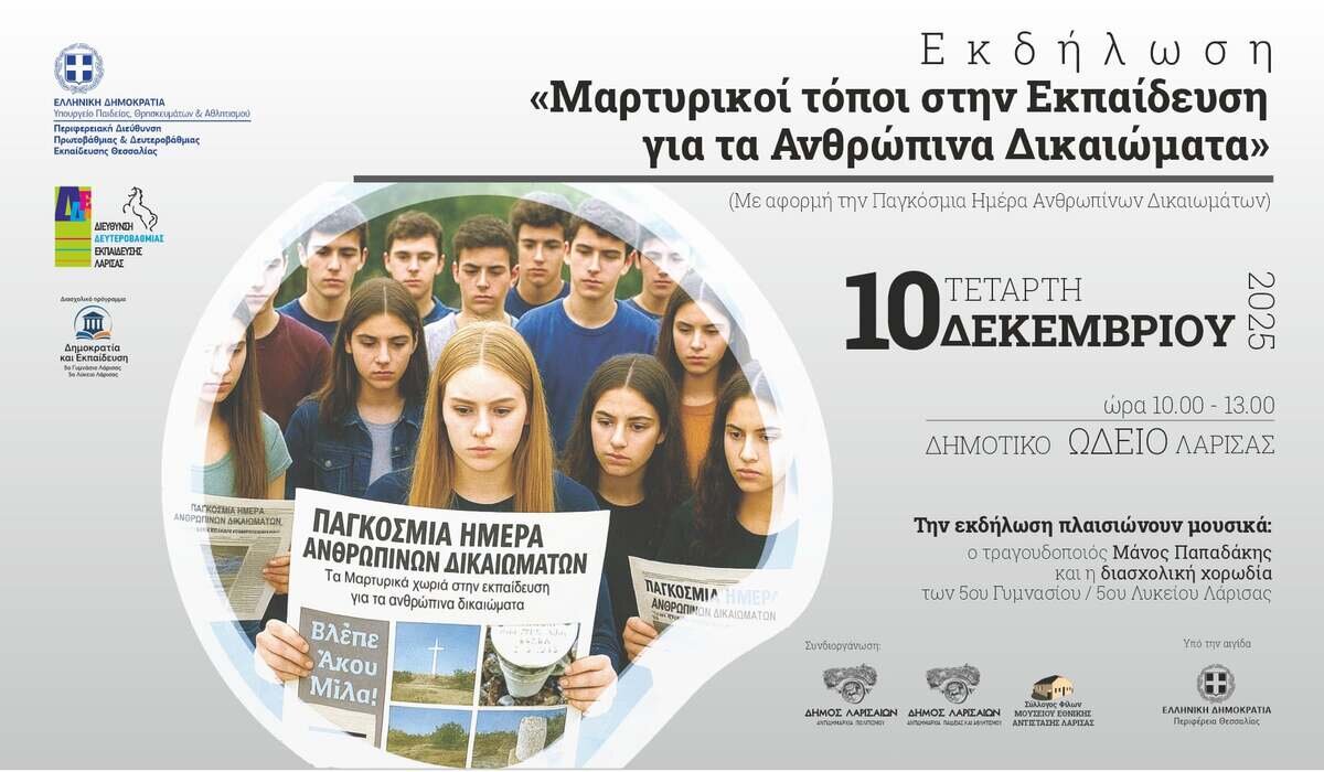 Με αφορμή την Παγκόσμια Ημέρα Ανθρωπίνων Δικαιωμάτων, την Τετάρτη 10 Δεκεμβρίου 2025, μαθητές, εκπαιδευτικοί, μουσικοί και πανεπιστημιακοί συναντώνται στο Δημοτικό Ωδείο Λάρισας (ώρες 10:00–13:00) στην εκδήλωση με τίτλο «Μαρτυρικοί τόποι στην Εκπαίδευση για τα Ανθρώπινα Δικαιώματα».