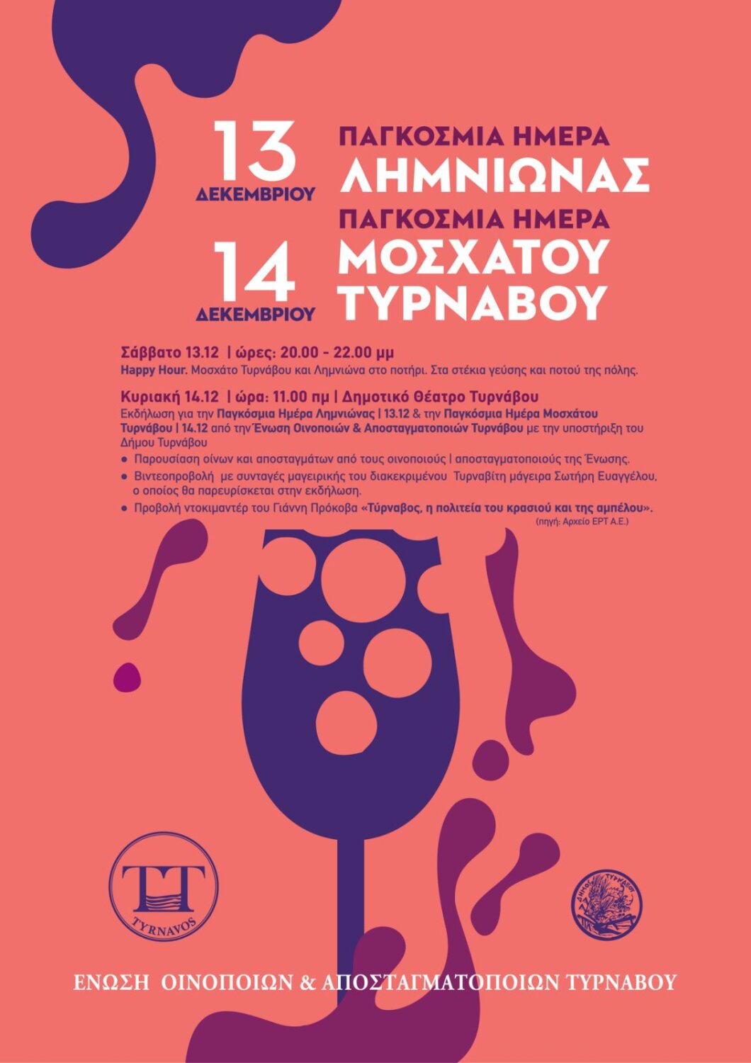 Η Ένωση Οινοποιών & Αποσταγματοποιών Τυρνάβου (Tyrnavos Wines & Spirits) διοργανώνει με την υποστήριξη του Δήμου Τυρνάβου για πρώτη χρονιά το ετήσιο διήμερο αφιερωμένο στις δύο ποικιλίες που αποτελούν τον θεμέλιο λίθο της αμπελουργικής ταυτότητας της περιοχής: τη Λημνιώνα και το Μοσχάτο Τυρνάβου. Με την Παγκόσμια Ημέρα Λημνιώνας στις 13 Δεκεμβρίου και την Παγκόσμια Ημέρα Μοσχάτου Τυρνάβου στις 14 Δεκεμβρίου, ο θεσμός που εγκαινιάστηκε πέρυσι αποκτά πλέον ακόμη μεγαλύτερη δυναμική, με τη φετινή διοργάνωση να περιλαμβάνει στοχευμένες δράσεις, συμμετοχή των οινοποιείων και αποσταγματοποιείων του Τυρνάβου και εκδηλώσεις που αναδεικνύουν συνολικά το οινικό και γαστρονομικό αποτύπωμα της περιοχής.