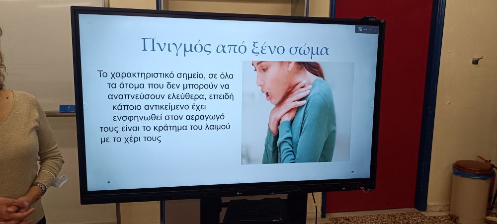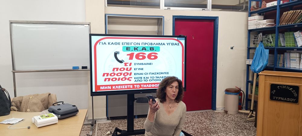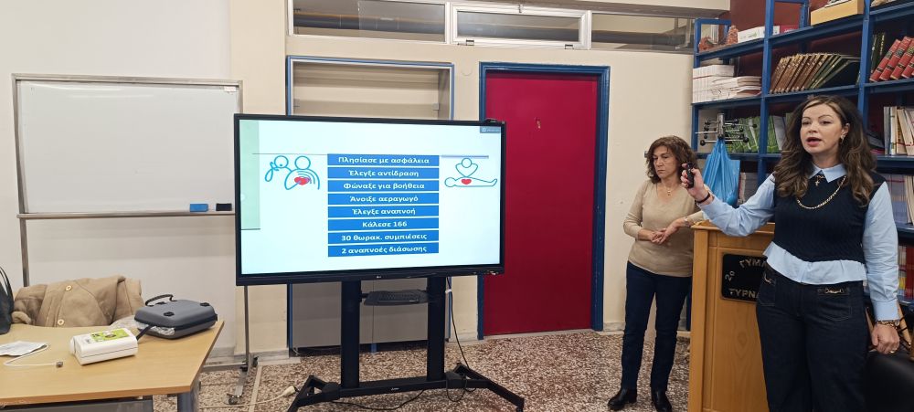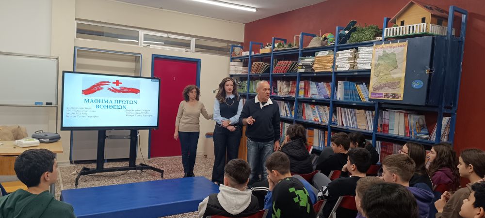 Μετά από σχετικό αίτημα του σχολείου, η Γενική Γιατρός κ. Σοφία Ξηρομερίσιου και η Νοσηλεύτρια κ. Γεωργία Καμπουρίδου από το Κέντρο Υγείας Τυρνάβου επισκέφθηκαν το σχολείο και υλοποίησαν ολοκληρωμένη εκπαίδευση Πρώτων Βοηθειών για όλους τους μαθητές και το εκπαιδευτικό προσωπικό.