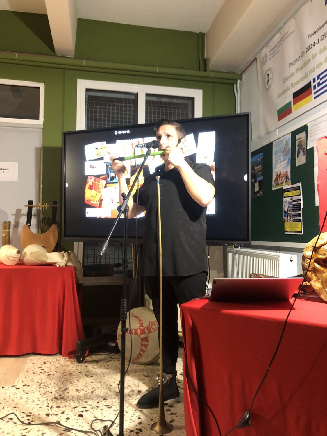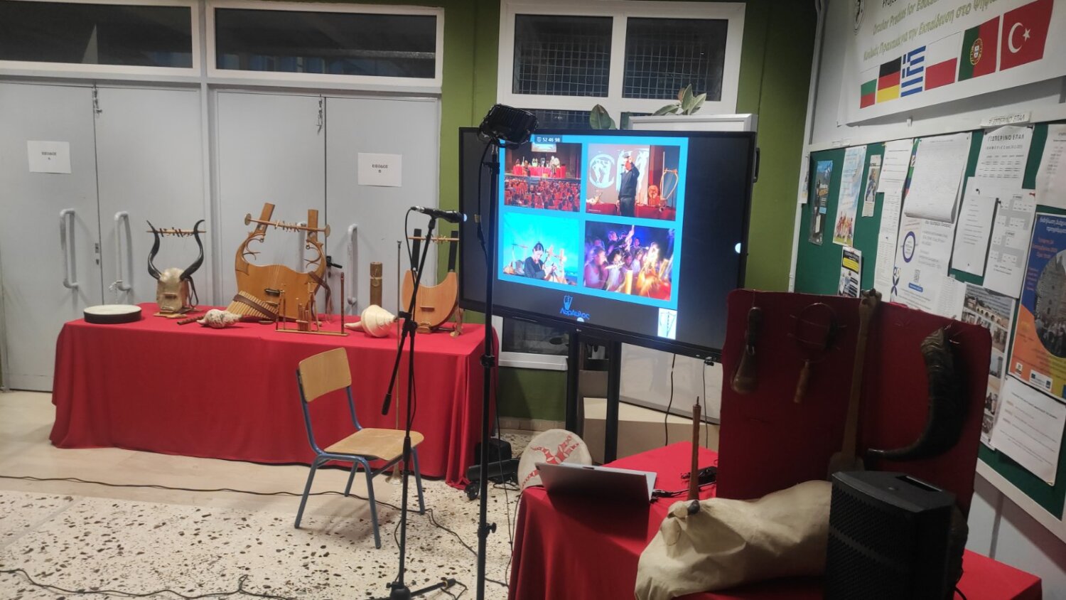 Μια πραγματικά σπάνια εκπαιδευτική εμπειρία, μια αξέχαστη ολοζώντανη δεξιοτεχνική, μουσικο-θεατρική παράσταση, ένα διαδραστικό μουσικό ταξίδι που γεφύρωσε το χθες, το σήμερα και το αύριο και συνοδεύτηκε από παράλληλη προβολή διαφανειών με παραστάσεις αγγείων με σκηνές από τη μουσική ζωή των αρχαίων Ελλήνων.
