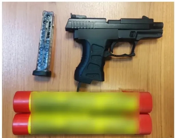 Σε έρευνα που πραγματοποιήθηκε στην οικία του, βρέθηκαν και κατασχέθηκαν αεροβόλο πιστόλι, που λειτουργεί με αμπούλες-φιαλίδια διοξειδίου του άνθρακα, γεμιστήρας με 14 μεταλλικά σφαιρίδια, καθώς και 2 ναυτικές φωτοβολίδες αλεξίπτωτου.