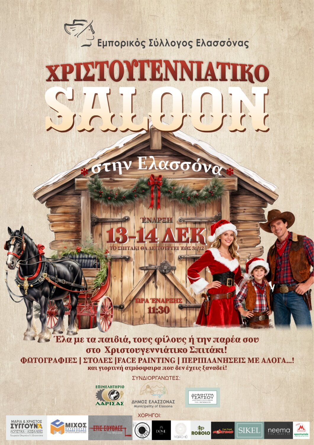 Έλα με τα παιδιά, τους φίλους ή την παρέα σου και ζήσε τη μαγεία του πιο ξεχωριστού Χριστουγεννιάτικου Saloon που έγινε ποτέ στην Ελασσόνα.
