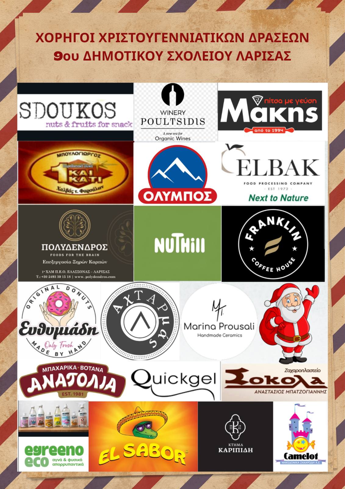 Ο Σύλλογος Γονέων και Κηδεμόνων του 9ου Δημοτικού Σχολείου Λάρισας θα ήθελε να ευχαριστήσει θερμά τους κάτωθι χορηγούς που ανταποκρίθηκαν θετικά και με εκτίμηση υποστήριξαν το έργο του συλλόγου:
