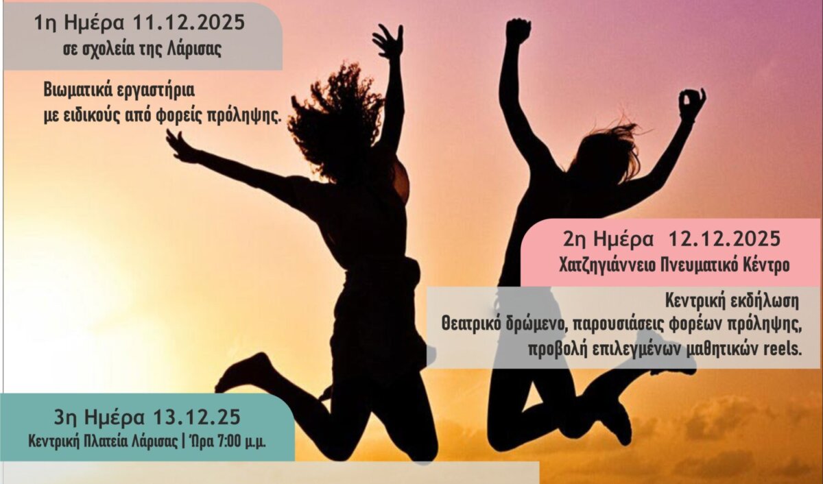 Η Αντιδημαρχία Παιδείας & Άθλησης και το Δημοτικό Συμβούλιο Νεολαίας, σε συνεργασία με τη Διεύθυνση Δευτεροβάθμιας Εκπαίδευσης Λάρισας, το Κέντρο Πρόληψης «Ορφέας», το Πρόγραμμα Προαγωγής Αυτοβοήθειας και το Κέντρο Ψυχικής Υγείας Λάρισας, διοργανώνουν τριήμερο δράσεων «Ζω Ελεύθερα – Νέοι & Νέες ενάντια στις Εξαρτήσεις».