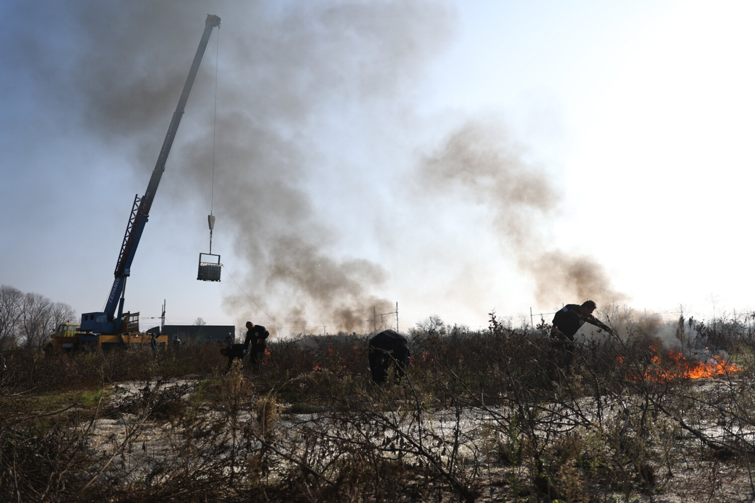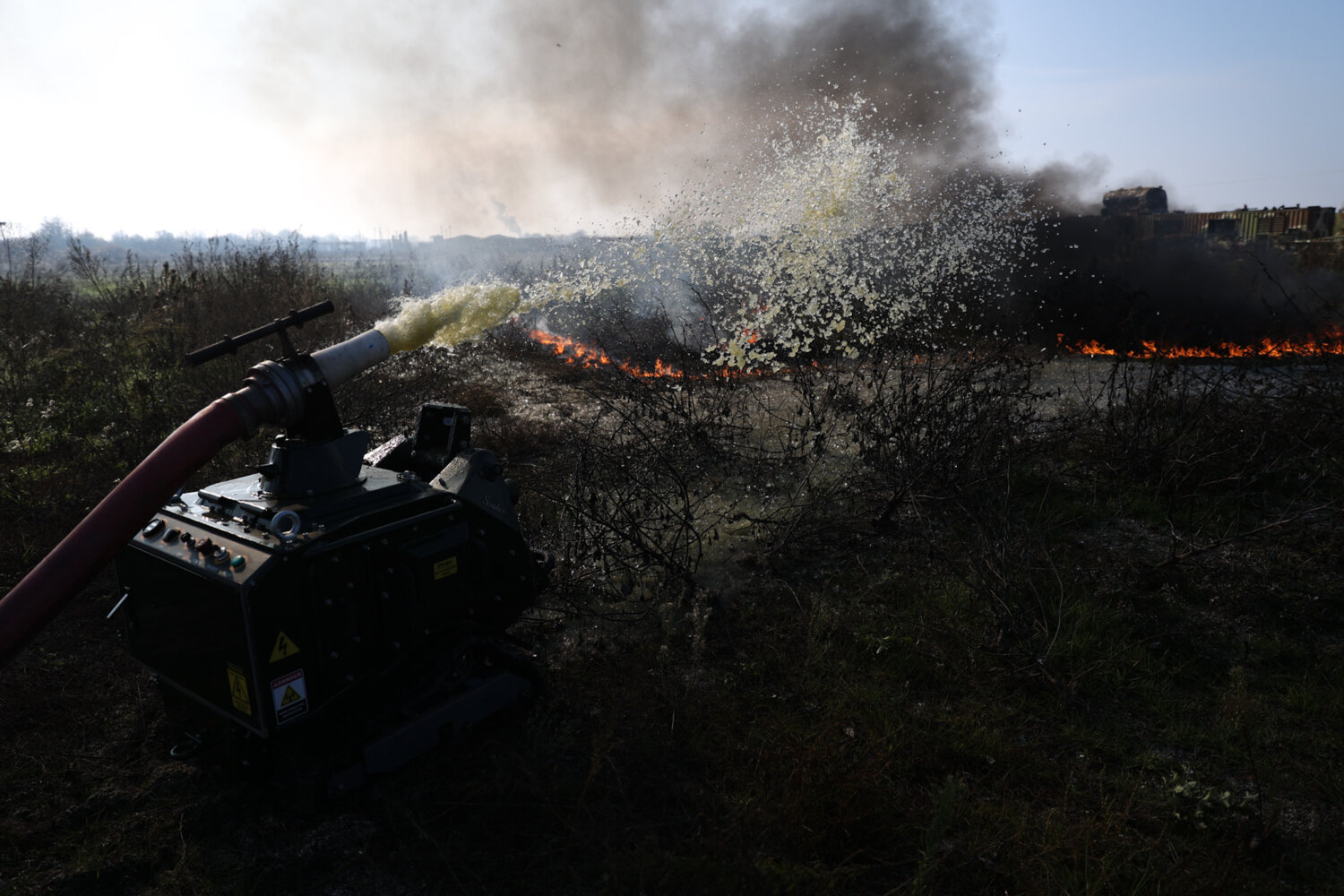 Η επίδειξη ολοκληρώθηκε με το ίδιο υλικό να λειτουργεί ως τρόπος κατάσβεσης φωτιάς και από το έδαφος, αλλά και από τον αέρα.