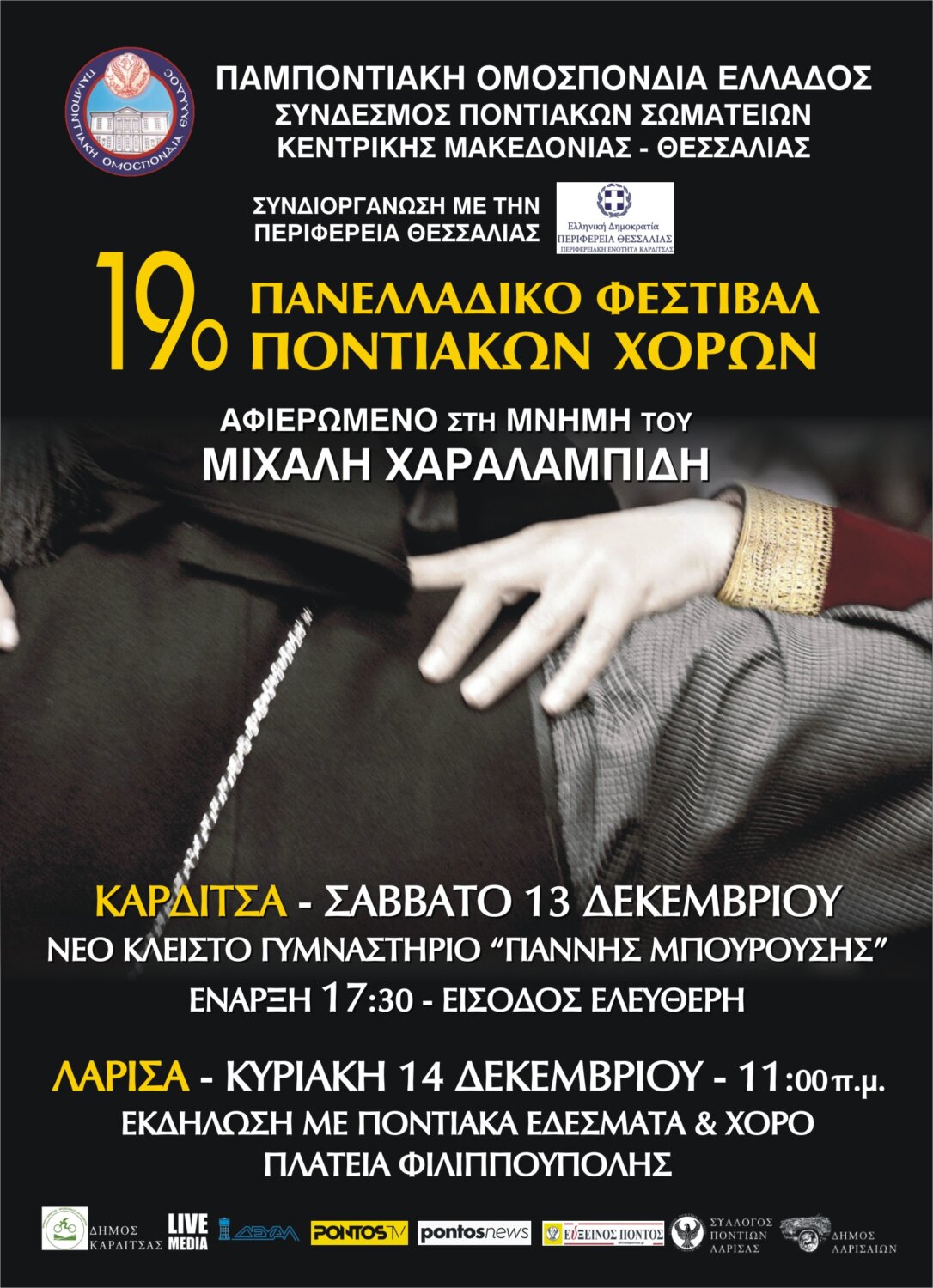 Το Σάββατο 13 Δεκεμβρίου και ώρα 17:30, στο νέο κλειστό γυμναστήριο Καρδίτσας «Γιάννης Μπουρούσης», σε συνδιοργάνωση με την Περιφέρεια Θεσσαλίας και με τη στήριξη του Δήμου Καρδίτσας, υπό την οργανωτική ευθύνη του Συνδέσμου Ποντιακών Σωματείων Κεντρικής Μακεδονίας και Θεσσαλίας και του Συλλόγου Ποντίων Λάρισας, περισσότεροι από 2.000 χορευτές θα αναδείξουν την ιστορία, τον πολιτισμό και την παράδοση των Ελλήνων του Πόντου.