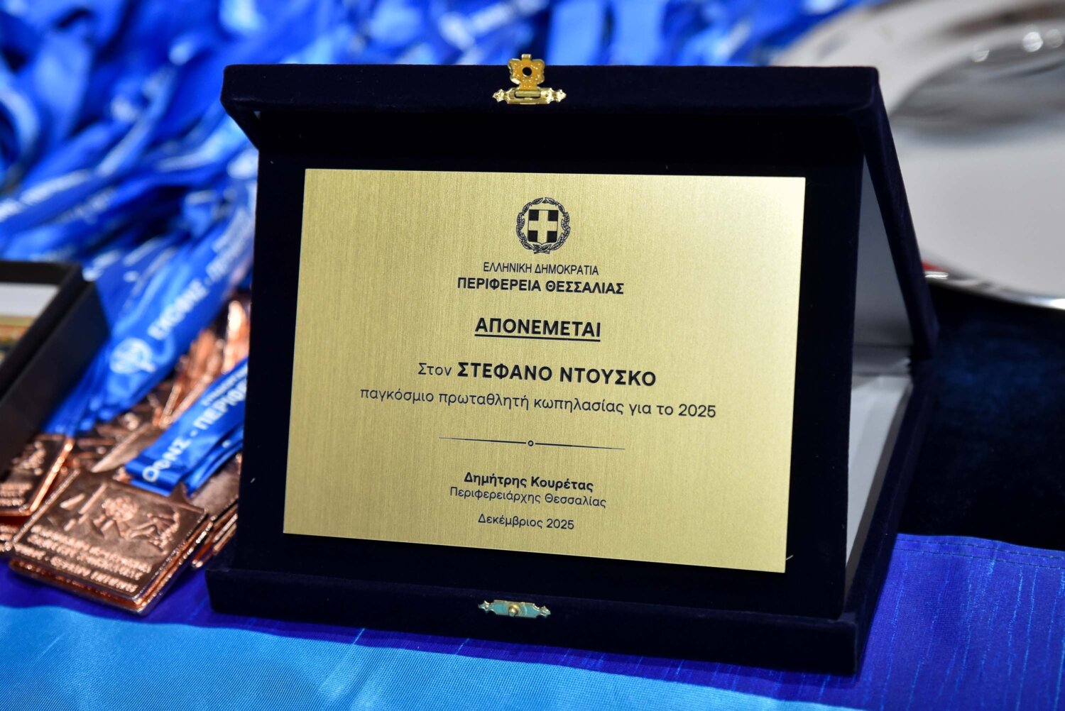 Κατά τη διάρκεια της τελετής, ο Περιφερειάρχης παρέδωσε τιμητική πλακέτα στον χρυσό Ολυμπιονίκη και Παγκόσμιο Πρωταθλητή Στέφανο Ντούσκο, αναγνωρίζοντας τη σπουδαία προσφορά του στον ελληνικό αθλητισμό και την κωπηλασία.