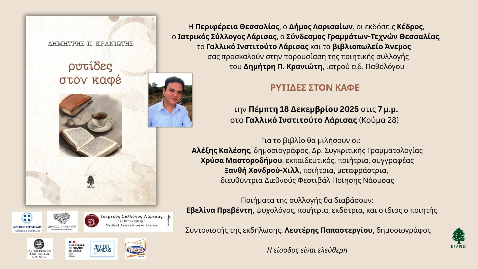 Ο Δημήτρης Π. Κρανιώτης ζει στη Λάρισα και εργάζεται ως ιατρός, ειδικός παθολόγος. Έχει εκδώσει έντεκα ποιητικές συλλογές στην Ελλάδα και στο εξωτερικό, με πιο πρόσφατη τη συλλογή «Ρυτίδες στον καφέ», που κυκλοφορεί από τις Εκδόσεις «Κέδρος» και πρόκειται να παρουσιαστεί στη Λάρισα, στο Γαλλικό Ινστιτούτο, στις 18 Δεκεμβρίου, στις 19:00. Ποιήματά του έχουν μεταφραστεί σε διάφορες γλώσσες, ενώ έχει συμμετάσχει σε πολλά Διεθνή Φεστιβάλ Ποίησης στο εξωτερικό. Στη συνέντευξη που ακολουθεί, ο ποιητής φωτίζει τις «αθέατες χαρακιές» που αφήνει ο χρόνος στην καθημερινότητα και εξηγεί πώς η ιατρική εμπειρία τροφοδοτεί την ποιητική του ματιά. Ακόμη, μιλά για τη μεταμόρφωση της φωνής του, για τη σιωπή ως δημιουργική ύλη και για τη θέση της ελληνικής ποίησης στο σύγχρονο παγκόσμιο τοπίο.
