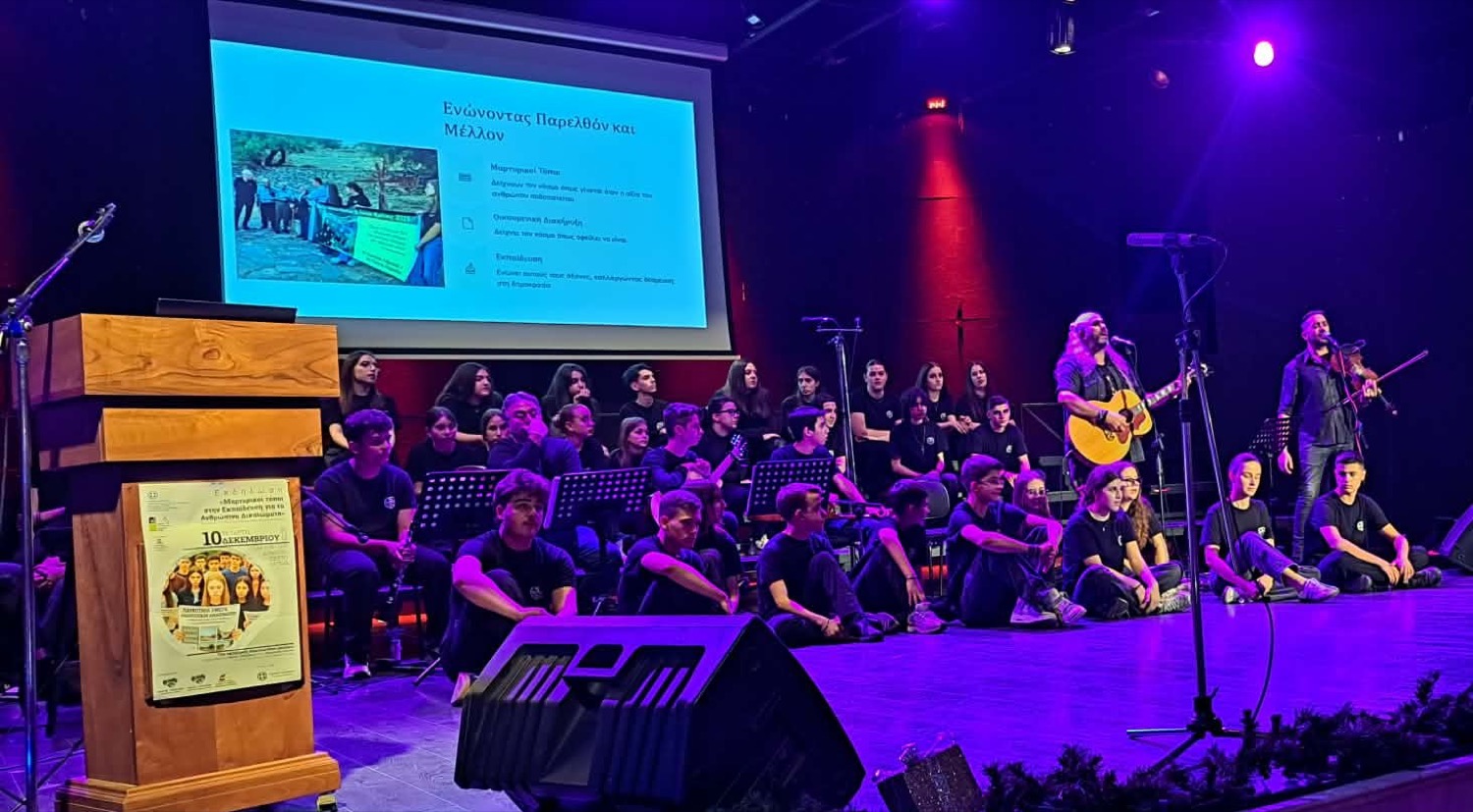 Με το μήνυμα «Βλέπε, Άκου, Μίλα» πραγματοποιήθηκε στο Δημοτικό Ωδείο Λάρισας, ανήμερα της Παγκόσμιας Ημέρας Ανθρωπίνων Δικαιωμάτων (Τετάρτη 10 Δεκεμβρίου 2025), η εκδήλωση με τίτλο «Μαρτυρικοί τόποι στην Εκπαίδευση για τα Ανθρώπινα Δικαιώματα», στο πλαίσιο του διασχολικού προγράμματος «Δημοκρατία και Εκπαίδευση» των 5ου Γυμνασίου/5ου Λυκείου Λάρισας.