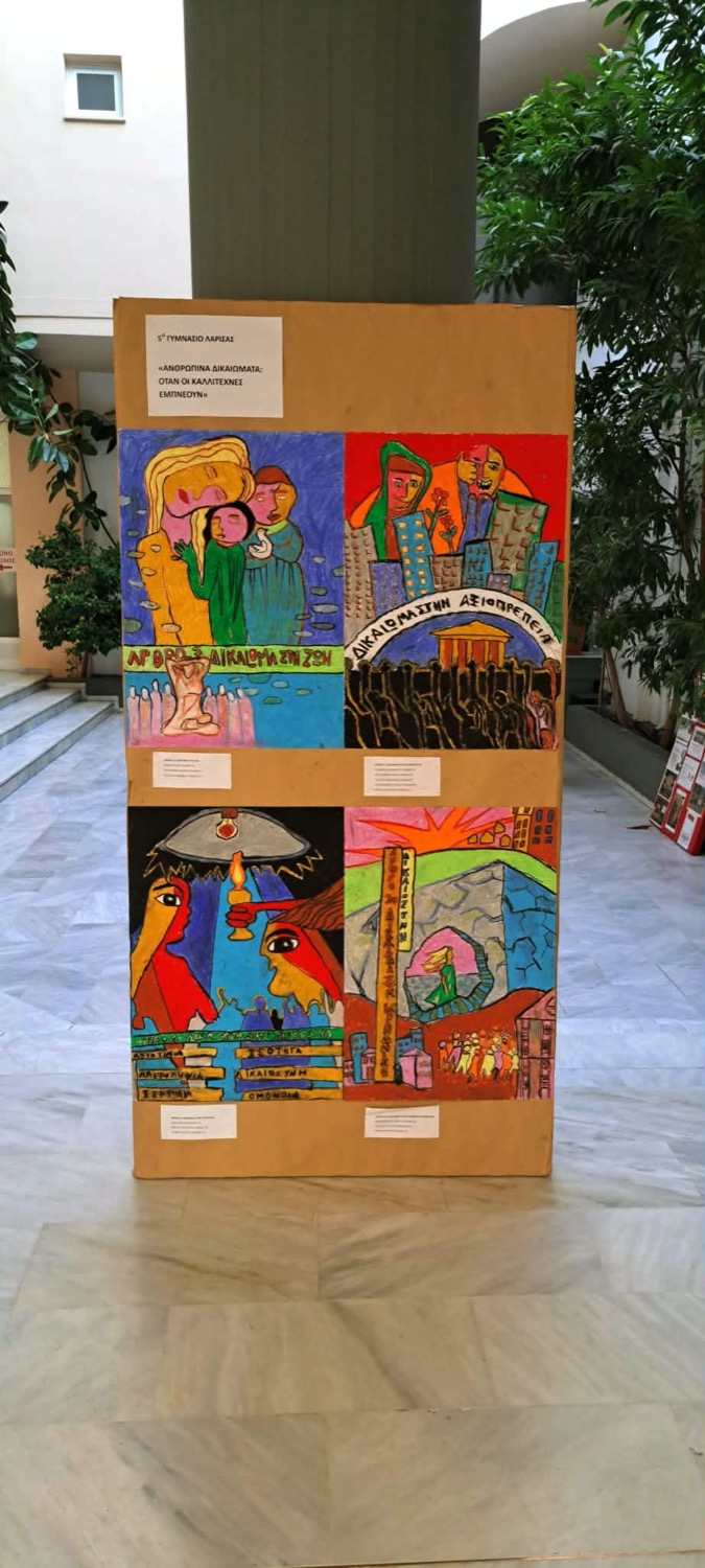 Παράλληλα, στο αίθριο του Δημοτικού Ωδείου λειτούργησε έκθεση φωτογραφίας και εικαστικών έργων αντιστασιακών καλλιτεχνών, καθώς και μαθητικών έργων. Εξαιρετικά εντυπωσιακές ήταν οι δημιουργίες των μαθητών του 5ου Γυμνασίου υπό την καθοδήγηση της εκπαιδευτικού Ευαγγελής Καραγγέλη, εμπνευσμένες από μεγάλους καλλιτέχνες και τα ανθρώπινα δικαιώματα.