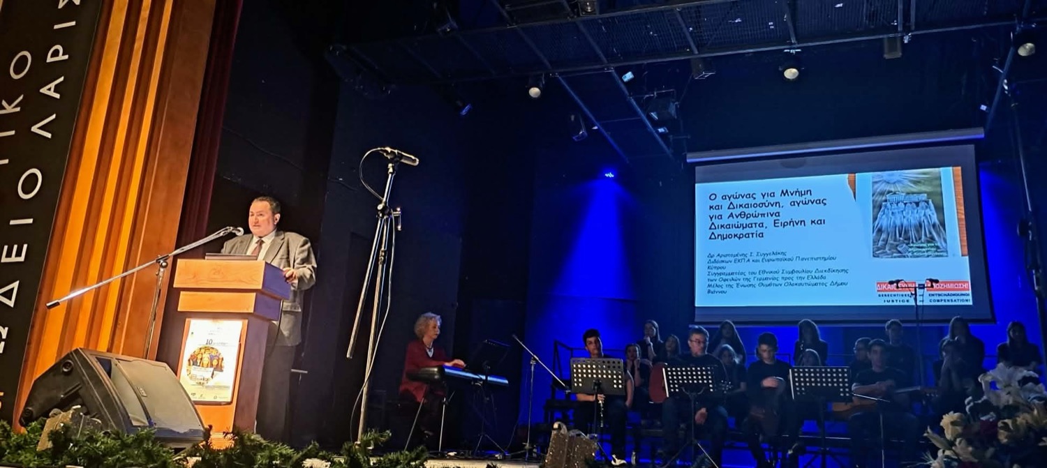 Η ιστορικός Δρ. Βασιλική Λάζου μίλησε για τα ανθρώπινα δικαιώματα «στις φλόγες»: τα ολοκαυτώματα των Μαρτυρικών χωριών και τα εγκλήματα εναντίον αμάχων, ενώ ο πανεπιστημιακός Δρ. Αριστομένης Συγγελάκης, Συγγραμματέας του Εθνικού Συμβουλίου Διεκδίκησης των Οφειλών της Γερμανίας προς την Ελλάδα, αναφέρθηκε στον αγώνα για Μνήμη και Δικαιοσύνη ως θεμέλιο για Ειρήνη, Δημοκρατία και Ανθρώπινα Δικαιώματα.