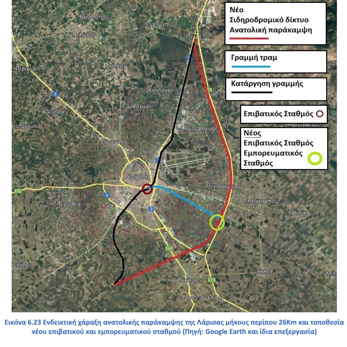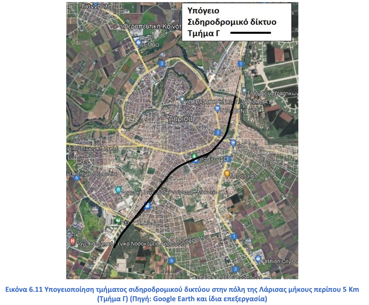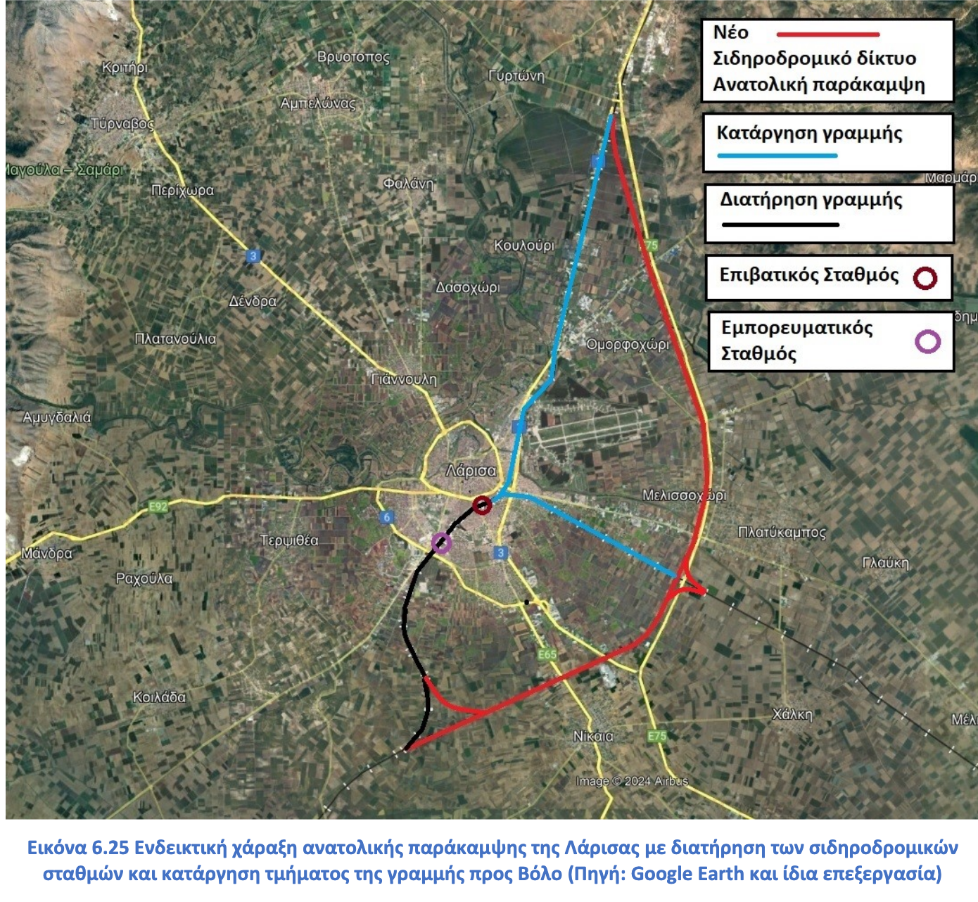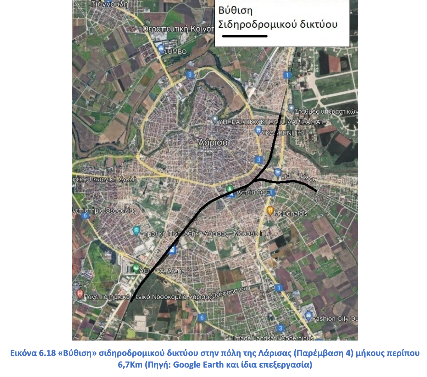- Τεχνικές λύσεις: Αναλύθηκε το εύρος των έξι συνολικά πιθανών τεχνικών λύσεων που εξετάστηκαν ειδικά για τη Λάρισα. Οι λύσεις αυτές εκτείνονται από το μηδενικό σενάριο και την Υπεργειοποίηση (Flyover), μέχρι τη βύθιση, την Υπογειοποίηση και τις εναλλακτικές χαράξεις (Παρακάμψεις).