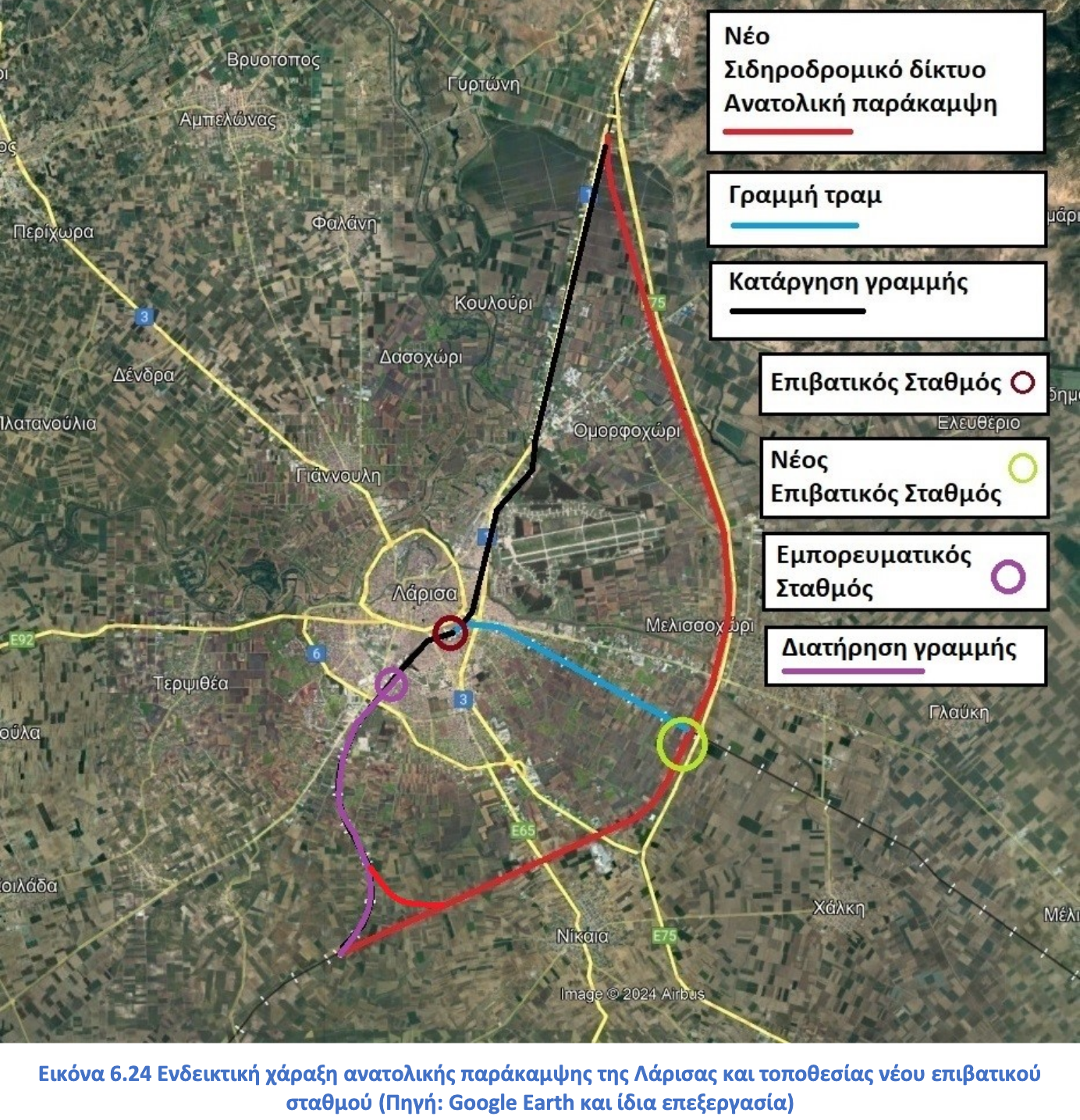 - Η ανάλυση των προτεινόμενων παρεμβάσεων κατέδειξε ως επικρατέστερες λύσεις, για τη συνολική αντιμετώπιση των προβλημάτων που δημιουργούνται από τη διέλευση των σιδηροδρομικών γραμμών εντός του αστικού ιστού της Λάρισας, την υπογειοποίηση των σιδηροδρομικών γραμμών με την κατασκευή σήραγγας κλειστής ή υπόγειας διάνοιξης, την υπογειοποίηση των γραμμών με κατασκευή σήραγγας cut & cover και την νέα ανατολική χάραξη. Προκειμένου να επιλεγεί η προκρινόμενη παρέμβαση, θα πρέπει να υλοποιηθούν αναλυτικές τεχνικές και οικονομικές μελέτες και να ληφθούν υπόψη τυχόν μετεγκαταστάσεις των σιδηροδρομικών σταθμών.
