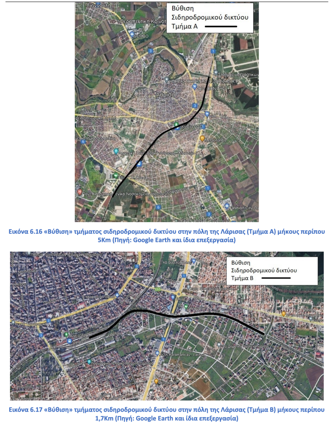 - Για την περίπτωση της πόλης των Τρικάλων και της Καρδίτσας προτείνονται παρεμβάσεις όπως η τοποθέτηση περίφραξης / ηχοπετασμάτων και όπου κριθεί αναγκαίο η υπογειοποίηση του οδικού δικτύου.