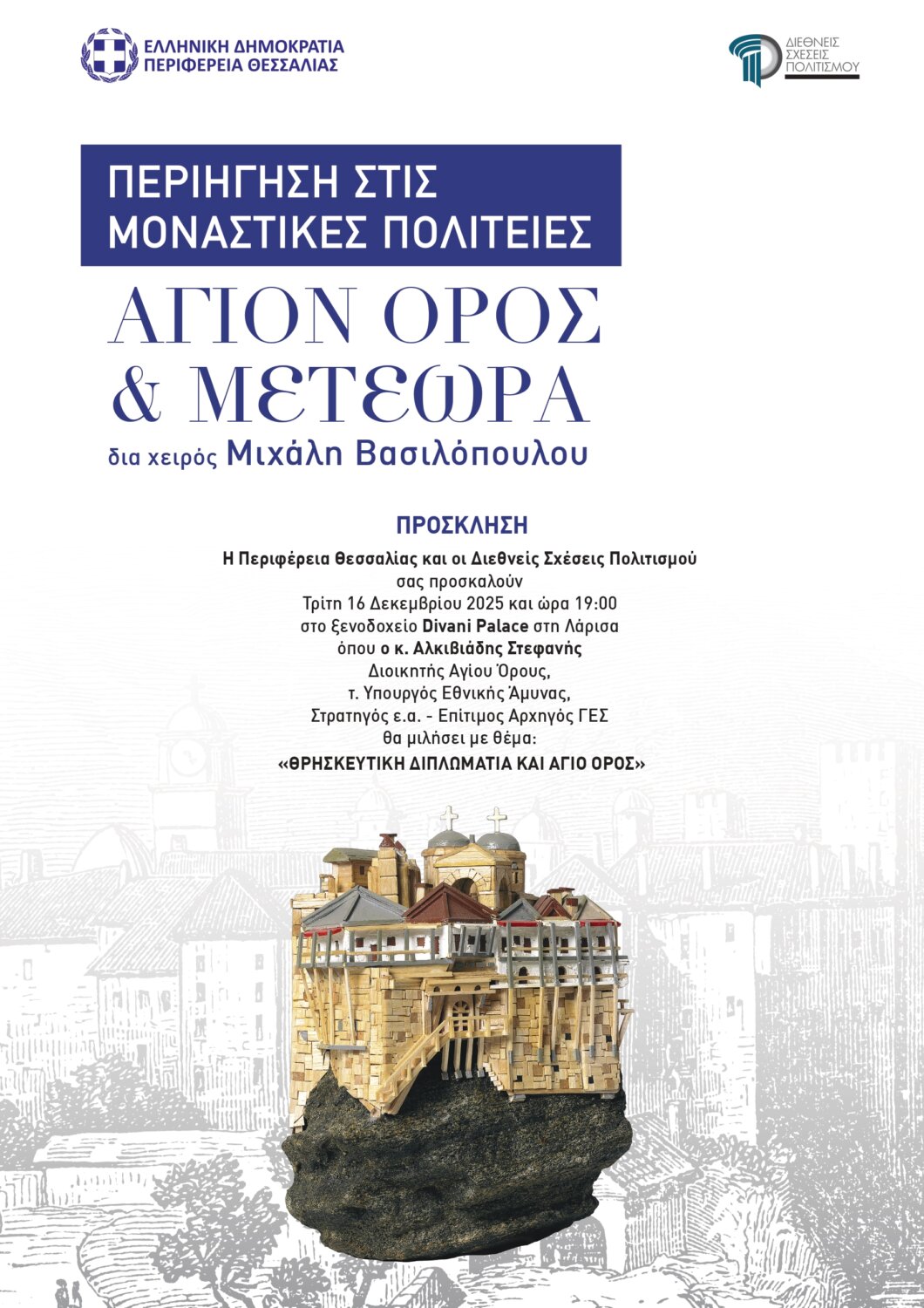 Μετά την μεγάλη επιτυχία της Έκθεσης «Περιήγηση στις Μοναστικές Πολιτείες – Άγιον Όρος & Μετέωρα» δια χειρός Μιχάλη Βασιλόπουλου, που παρουσιάστηκε φέτος στη Λάρισα, η Περιφέρεια Θεσσαλίας και οι Διεθνείς Σχέσεις Πολιτισμού διοργανώνουν μια σημαντική εκδήλωση πριν κλείσει η χρονιά, και σας προσκαλούν την Τρίτη 16 Δεκεμβρίου 2025 και ώρα 19.00 στο ξενοδοχείο Divani Palace στη Λάρισα, όπου ο κύριος Αλκιβιάδης Στεφανής, Διοικητής του Αγίου Όρους, τ. Υπουργός Εθνικής Άμυνας, Στρατηγός ε.α. – Επίτιμος Αρχηγός ΓΕΣ, θα μιλήσει με θέμα: Θρησκευτική διπλωματία και Άγιο Όρος.