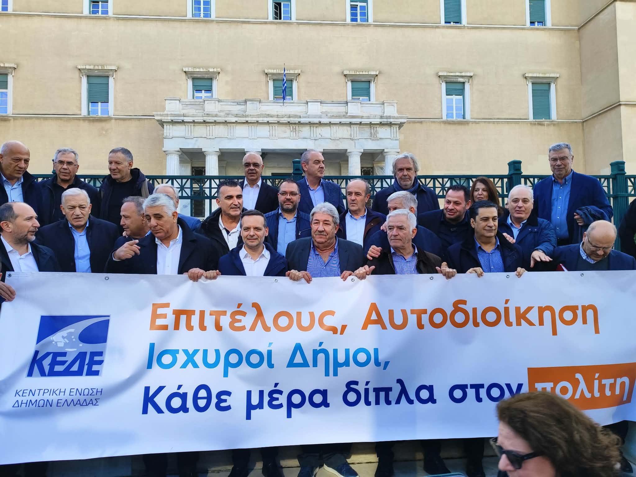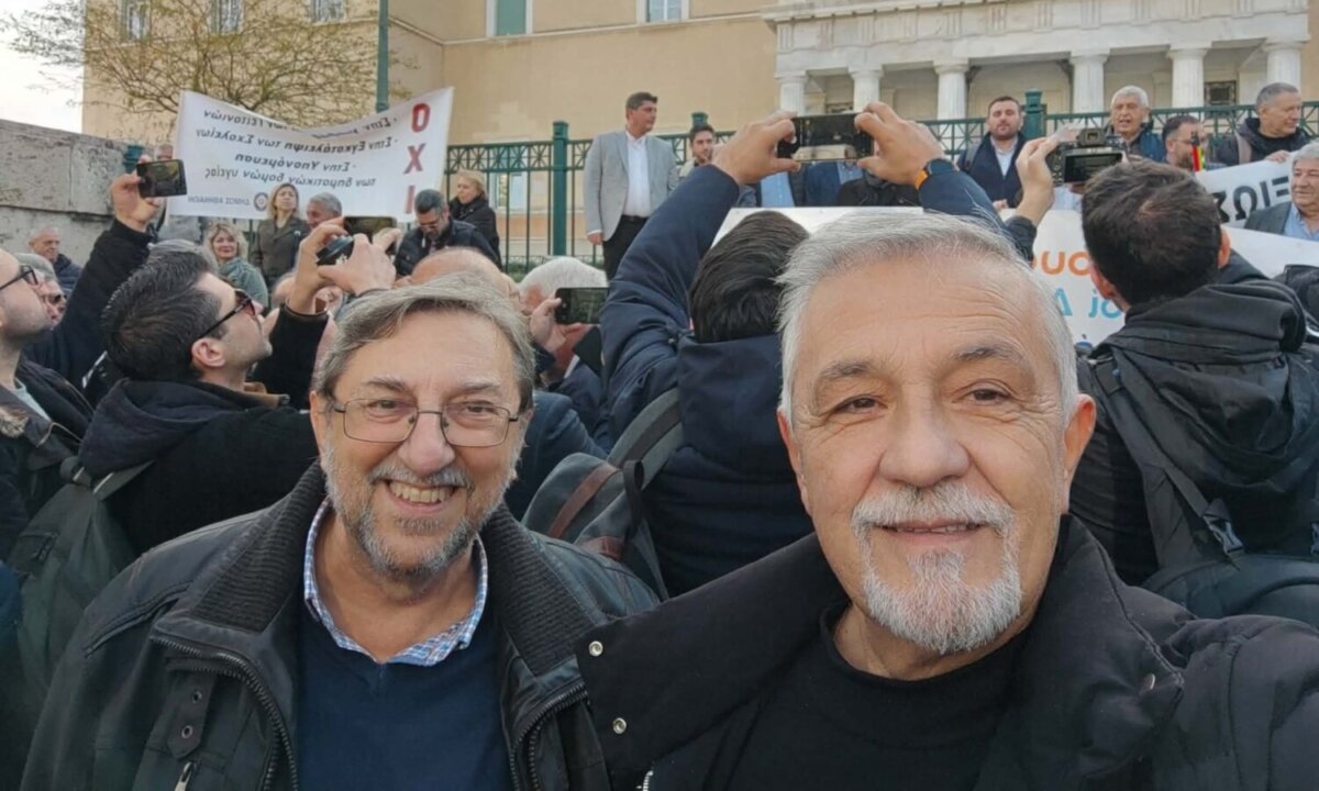 Έξω από τη Βουλή, στη συγκέντρωση της ΚΕΔΕ, βρίσκονται οι δημοτικοί σύμβουλοι της «Συμπαράταξης Λαρισαίων» Γιώργος Σούλτης και Μιχάλης Τολίκας.