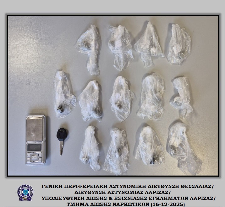 Συνελήφθη, χθες (15-12-2025) το απόγευμα στη Λάρισα, από αστυνομικούς του Τμήματος Δίωξης Ναρκωτικών της Υποδιεύθυνσης Δίωξης και Εξιχνίασης Εγκλημάτων Λάρισας, ένας ανήλικος ημεδαπός, σε βάρος του οποίου σχηματίστηκε δικογραφία για παράβαση της νομοθεσίας περί ναρκωτικών.
