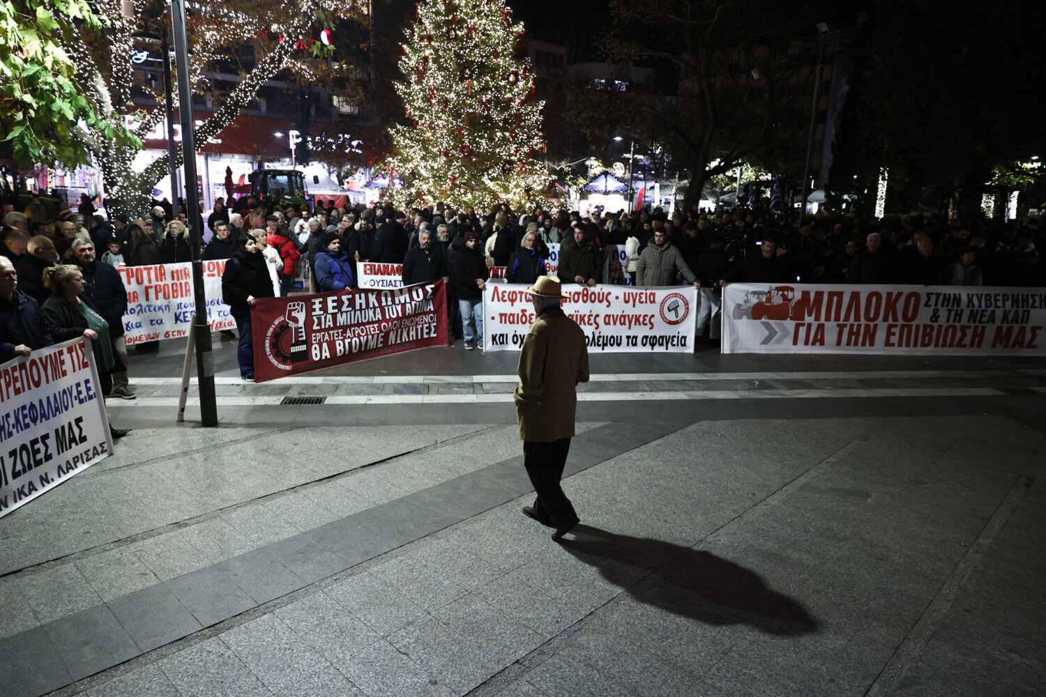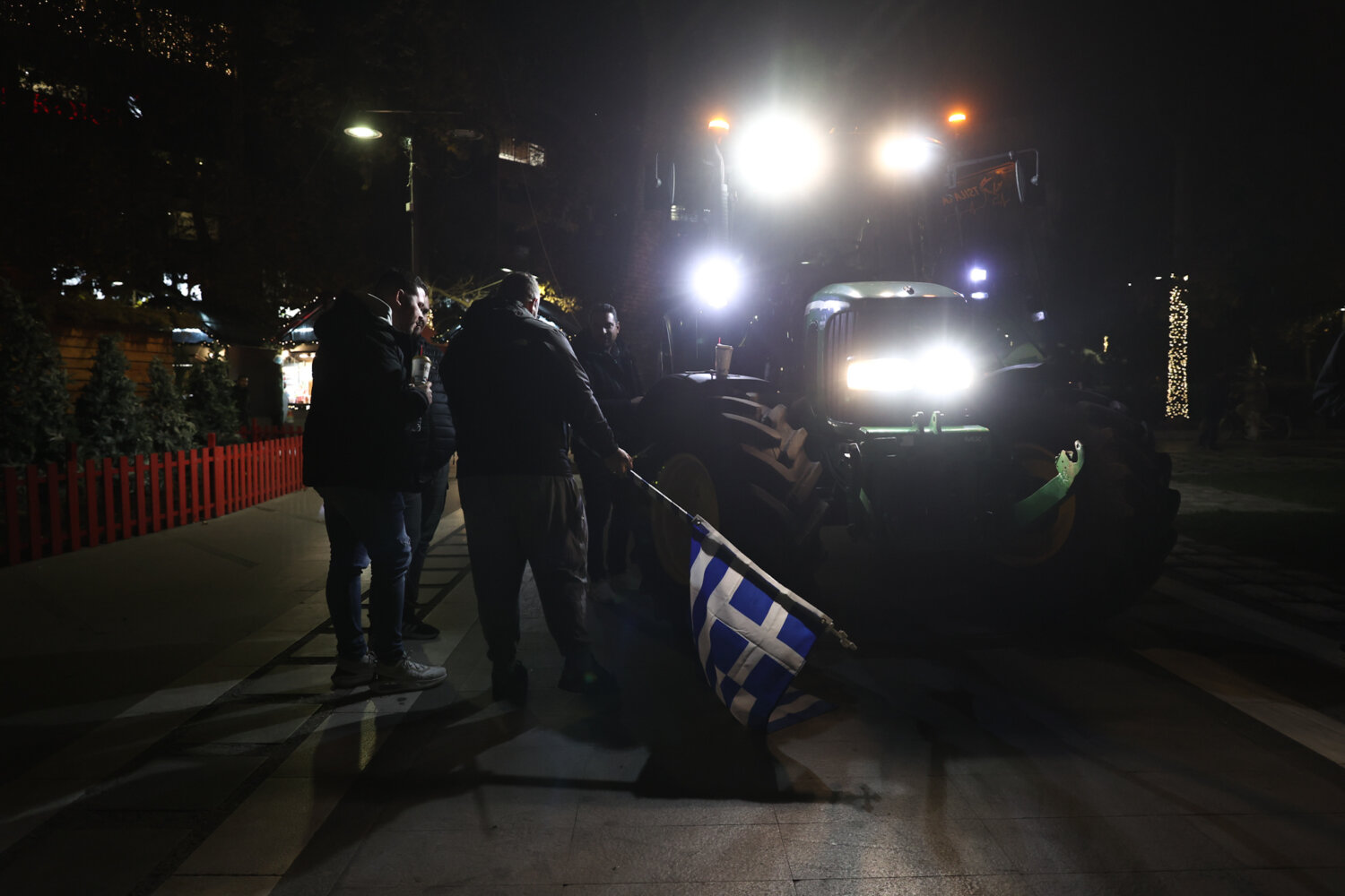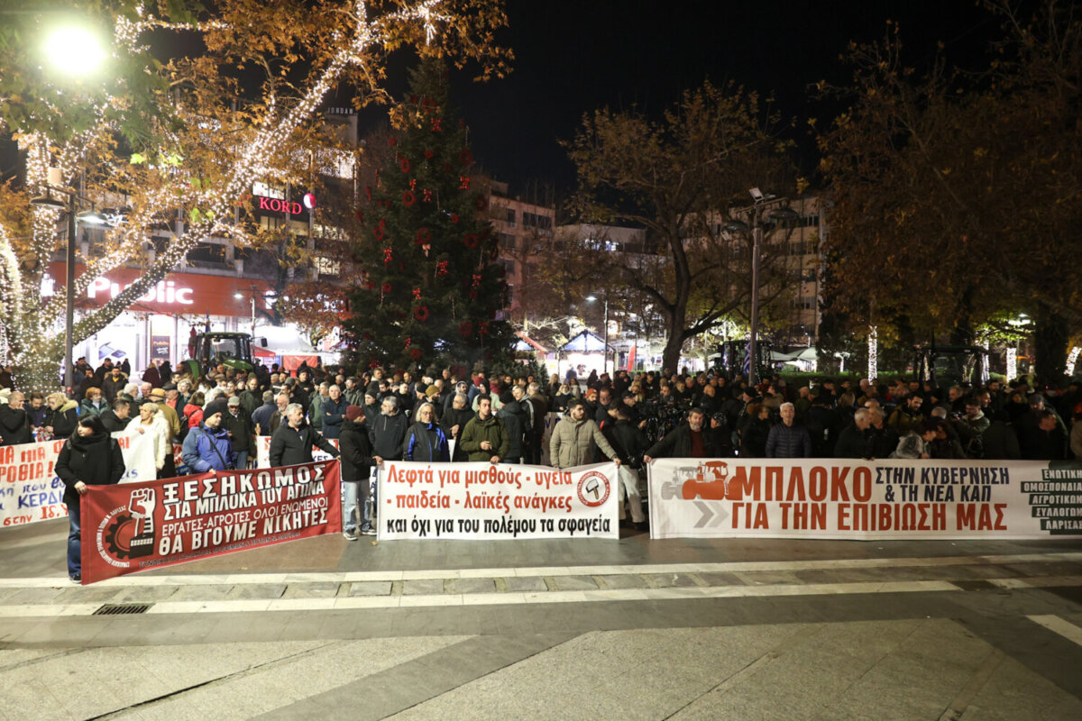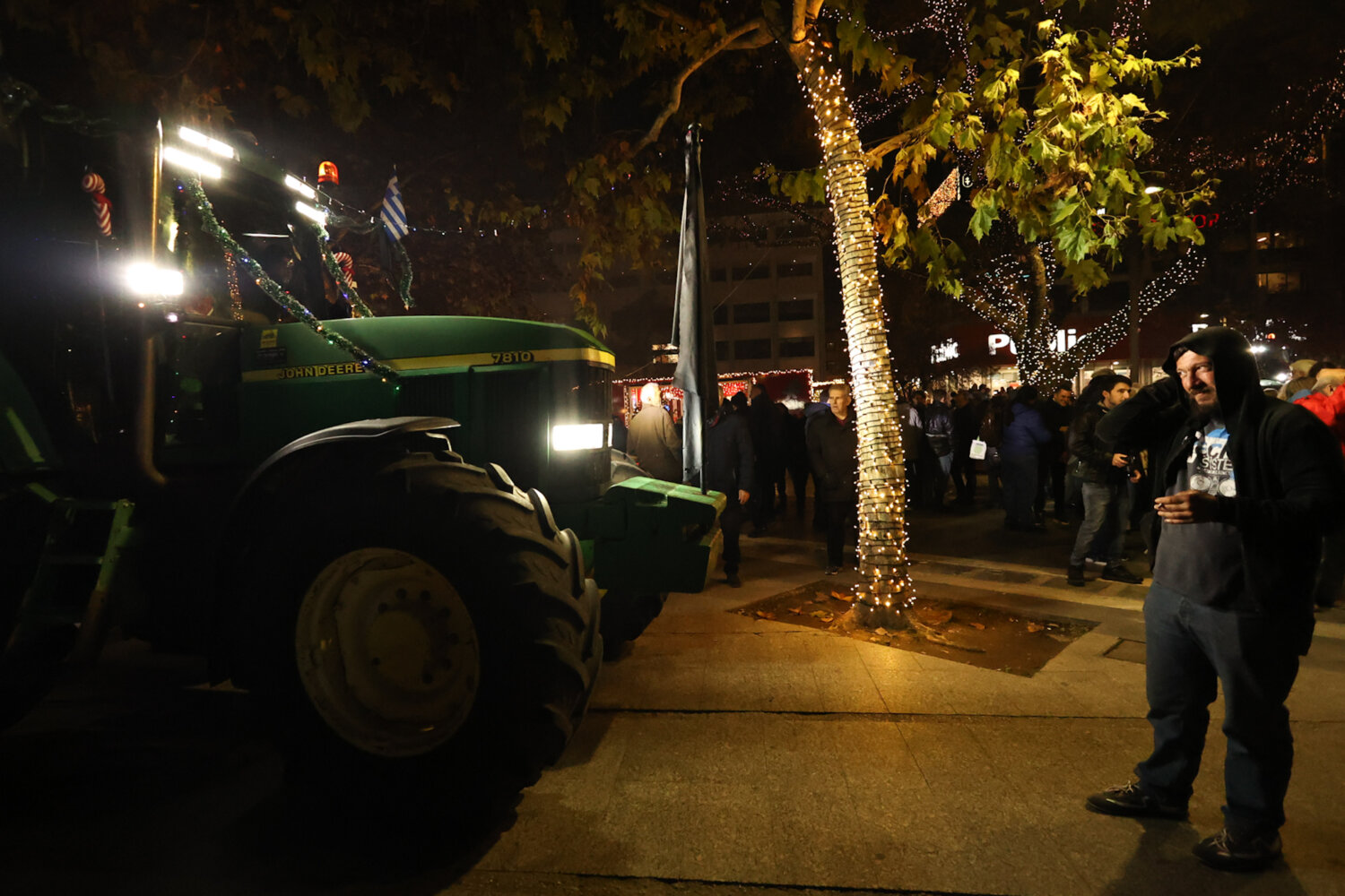 Η στολισμένη πλατεία είναι γεμάτη από πανό και πολίτες που διαδηλώνουν κατά της ψήφισης του προϋπολογισμού αλλά και υπέρ των αιτημάτων των αγροτών και κτηνοτρόφων, που βρίσκονται εκεί με συμβολικό αριθμό τρακτέρ από το μπλόκο της Νίκαιας.