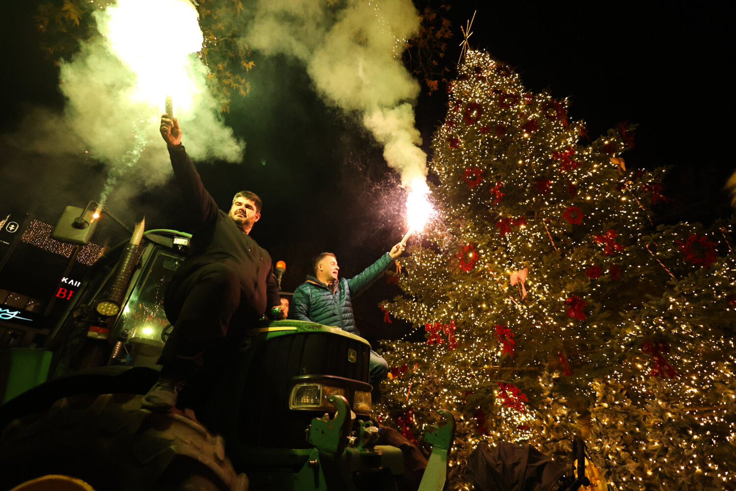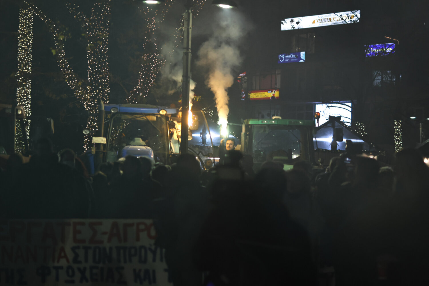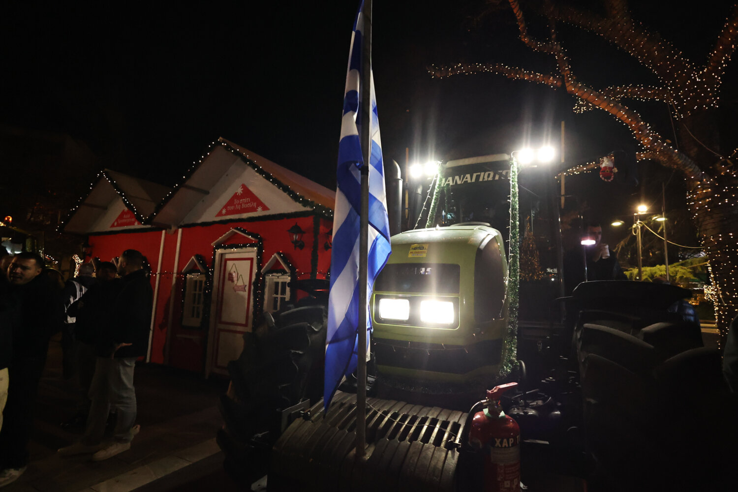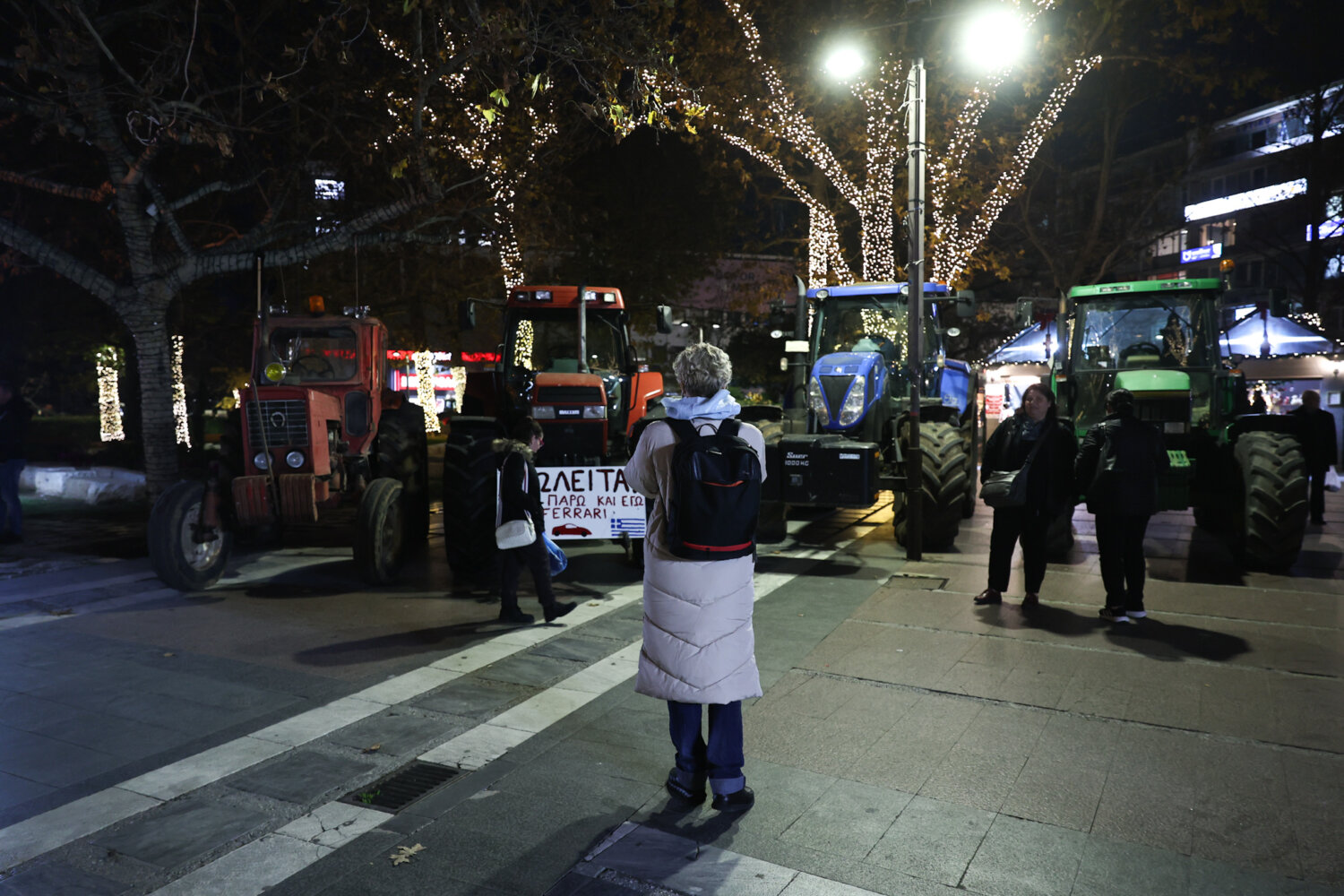 Η στολισμένη πλατεία είναι γεμάτη από πανό και πολίτες που διαδηλώνουν κατά της ψήφισης του προϋπολογισμού αλλά και υπέρ των αιτημάτων των αγροτών και κτηνοτρόφων, που βρίσκονται εκεί με συμβολικό αριθμό τρακτέρ από το μπλόκο της Νίκαιας.