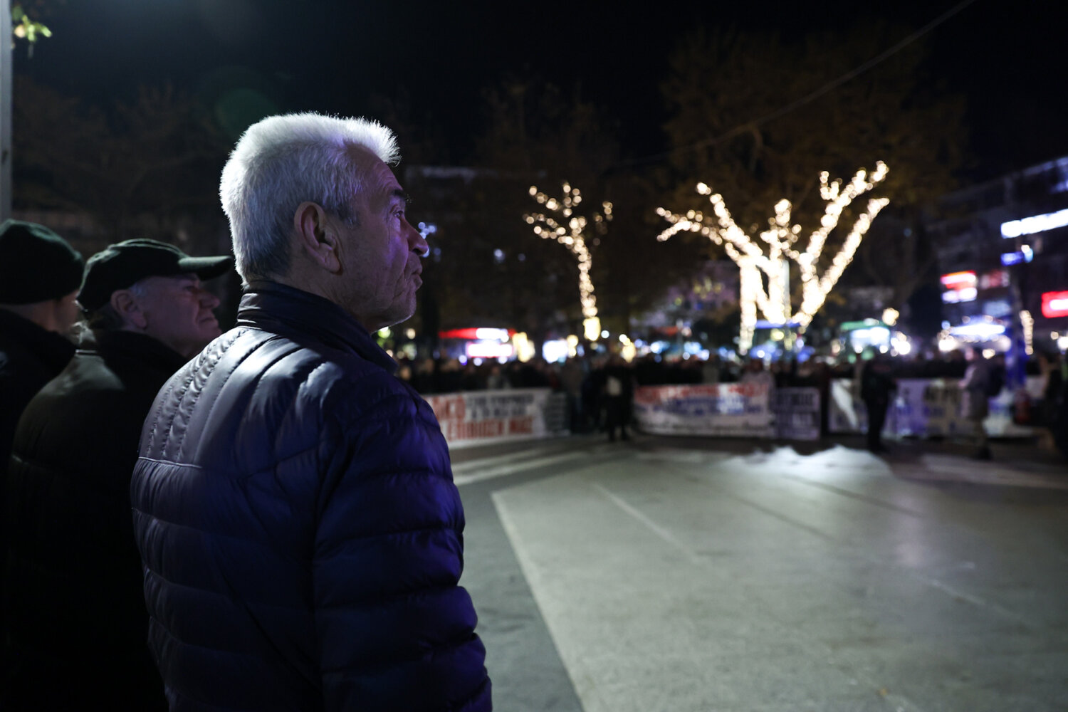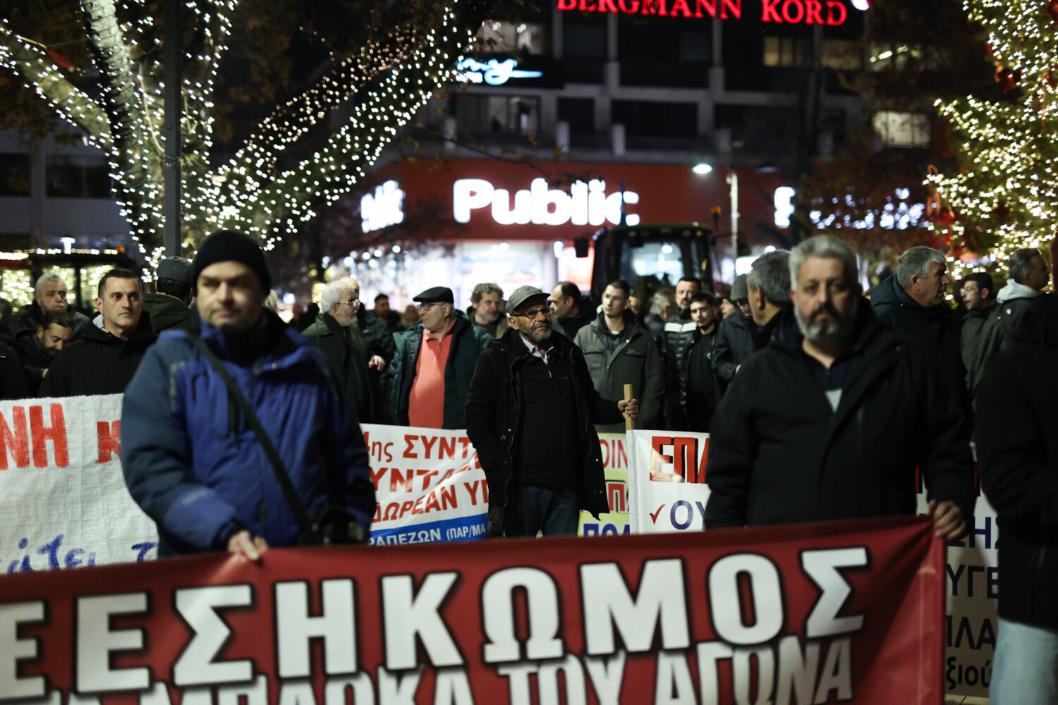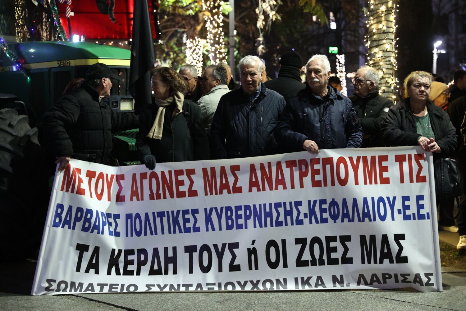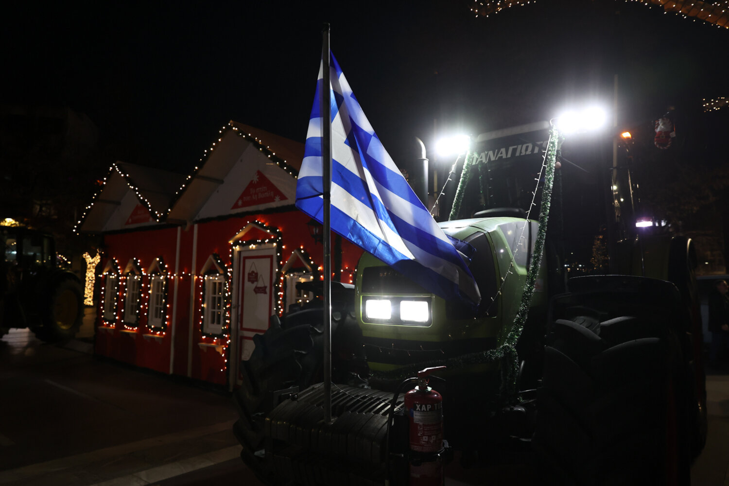 Η στολισμένη πλατεία είναι γεμάτη από πανό και πολίτες που διαδηλώνουν κατά της ψήφισης του προϋπολογισμού αλλά και υπέρ των αιτημάτων των αγροτών και κτηνοτρόφων, που βρίσκονται εκεί με συμβολικό αριθμό τρακτέρ από το μπλόκο της Νίκαιας.
