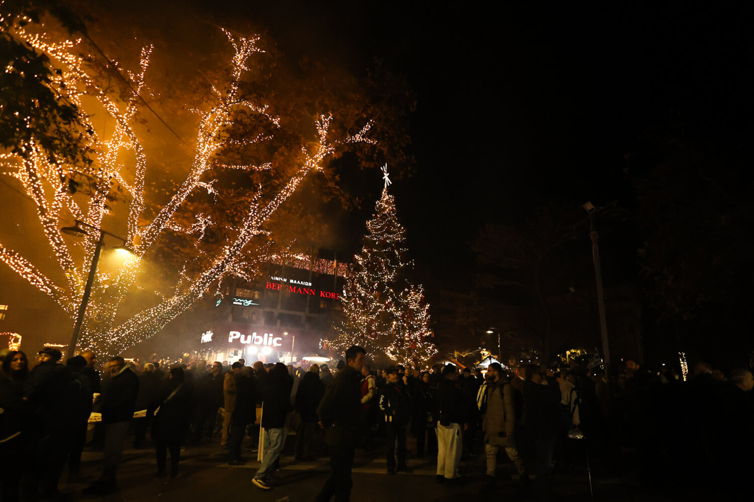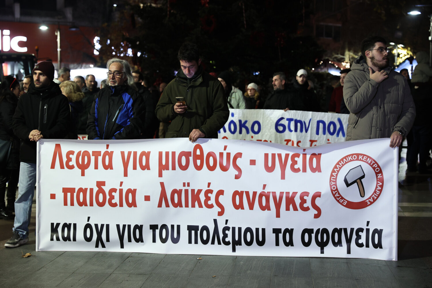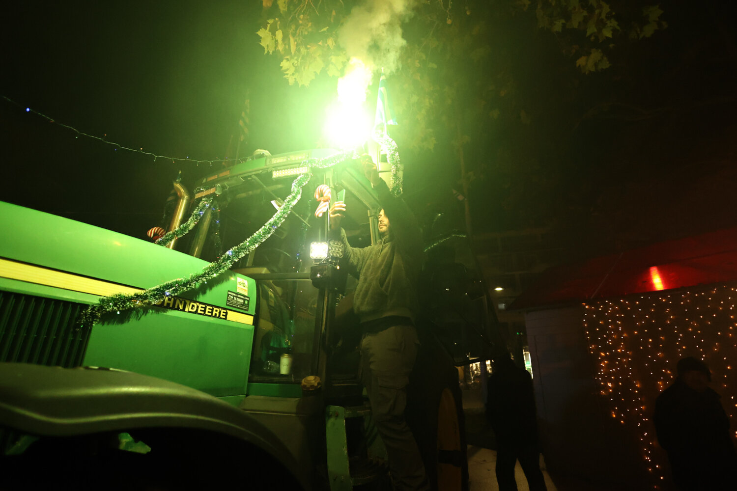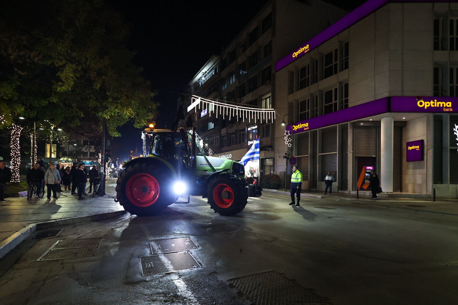 Η στολισμένη πλατεία είναι γεμάτη από πανό και πολίτες που διαδηλώνουν κατά της ψήφισης του προϋπολογισμού αλλά και υπέρ των αιτημάτων των αγροτών και κτηνοτρόφων, που βρίσκονται εκεί με συμβολικό αριθμό τρακτέρ από το μπλόκο της Νίκαιας.