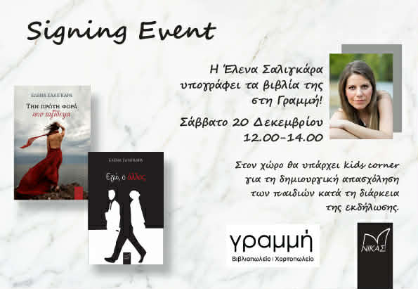 Η συγγραφέας Έλενα Σαλιγκάρα θα βρίσκεται το Σάββατο 20 Δεκεμβρίου και ώρα 12.00-14.00 στο βιβλιοπωλείο Γραμμή (Ολύμπου 25, Λάρισα).