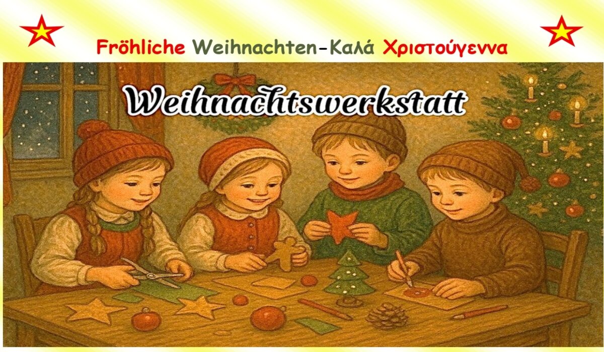 Η Τοπική Επιτροπή Καθηγητών Γερμανικής Γλώσσας Ν. Λάρισας, με τη στήριξη του Δήμου Λαρισαίων και της Αντιδημαρχίας Πολιτισμού, διοργανώνει για δεύτερη χρονιά το Weihnachtswerkstatt –Χριστουγεννιάτικο Διαδραστικό Εργαστήρι «για να γιορτάσουμε όλοι μαζί μικροί και μεγάλοι την πιο όμορφη περίοδο της χρονιάς. Το διήμερο εργαστήρι, που θα πραγματοποιηθεί στην καρδιά της πόλης, περιλαμβάνει: