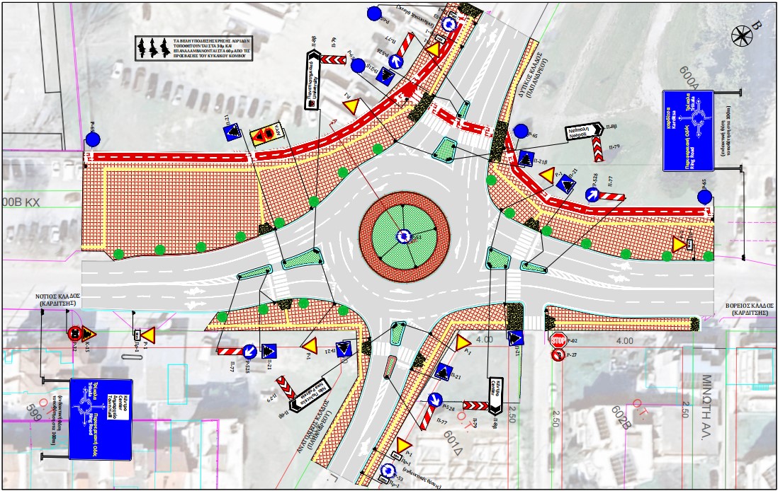 - Καρδίτσης – Παπανδρέου: Ο σηματοδοτούμενος κόμβος στη συμβολή των συγκεκριμένων οδών μετατρέπεται σε κυκλικό κόμβο, ο οποίος διευθετεί τις πραγματοποιούμενες κινήσεις των οχημάτων με μικρότερες καθυστερήσεις, βελτιώνει την οδική ασφάλεια στον κόμβο καθώς μειώνεται δραστικά η ταχύτητα κίνησης των οχημάτων και προστατεύονται οι κινήσεις των πεζών (μέσω σηματοδοτούμενων πεζοδιαβάσεων) και συντελεί στην αισθητική αναβάθμιση της περιοχής.