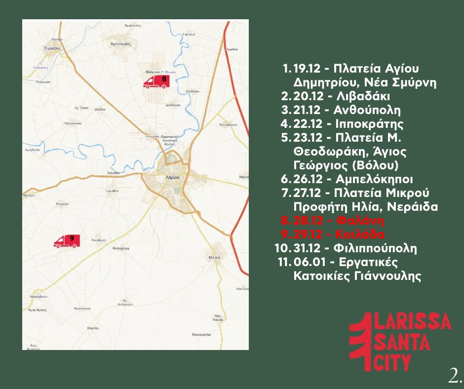 Από αύριο, Παρασκευή, 19 Δεκεμβρίου 2025 το απόγευμα -και για ένα τρίωρο σχεδόν κάθε μέρα, από τις 5.30 μ.μ. ως τις 8.30 μ.μ.- το Santa Truck θα μεταφέρει το πνεύμα των Χριστουγέννων σε κάθε γωνιά της πόλης, με δράσεις και πολλές εκπλήξεις για τους μικρούς μας φίλους.