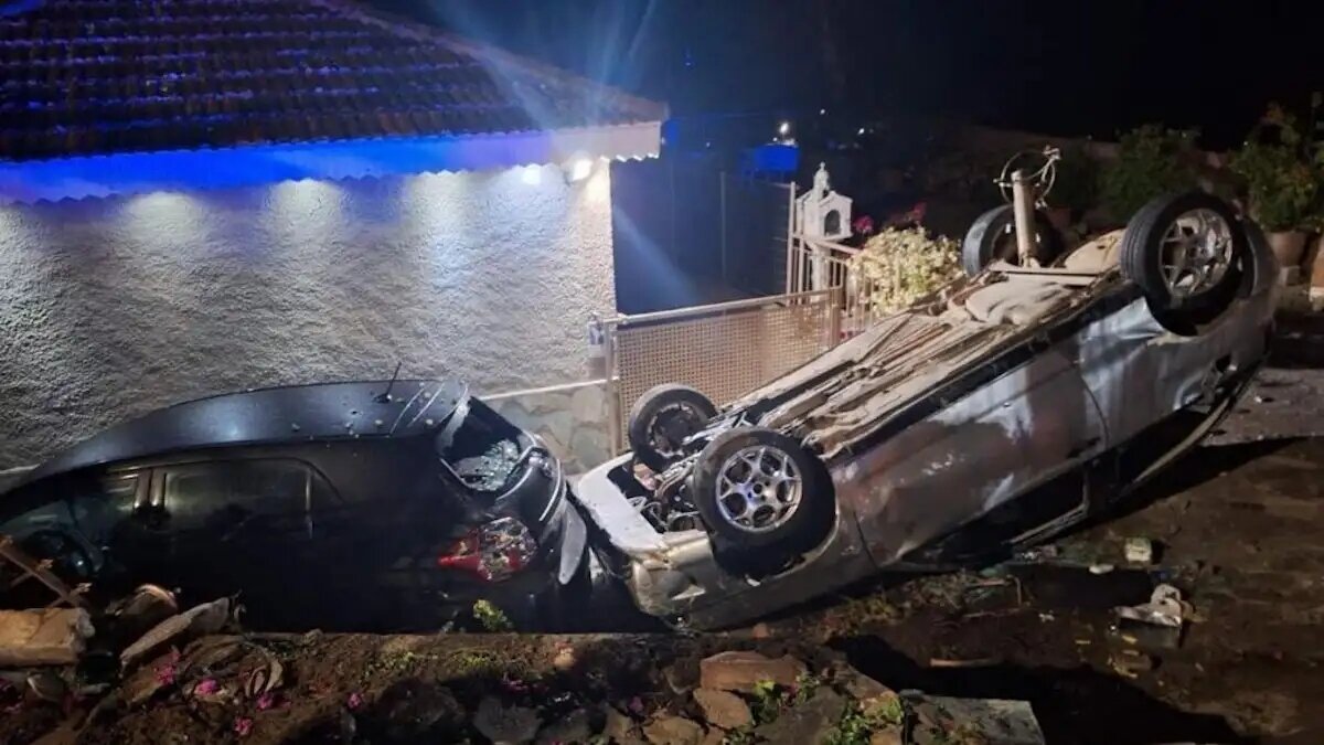 Το όχημα που προσγειώθηκε ανάποδα μπροστά από το σπίτι φαίνεται να προκάλεσε ζημιές και σε σταθμευμένο όχημα.